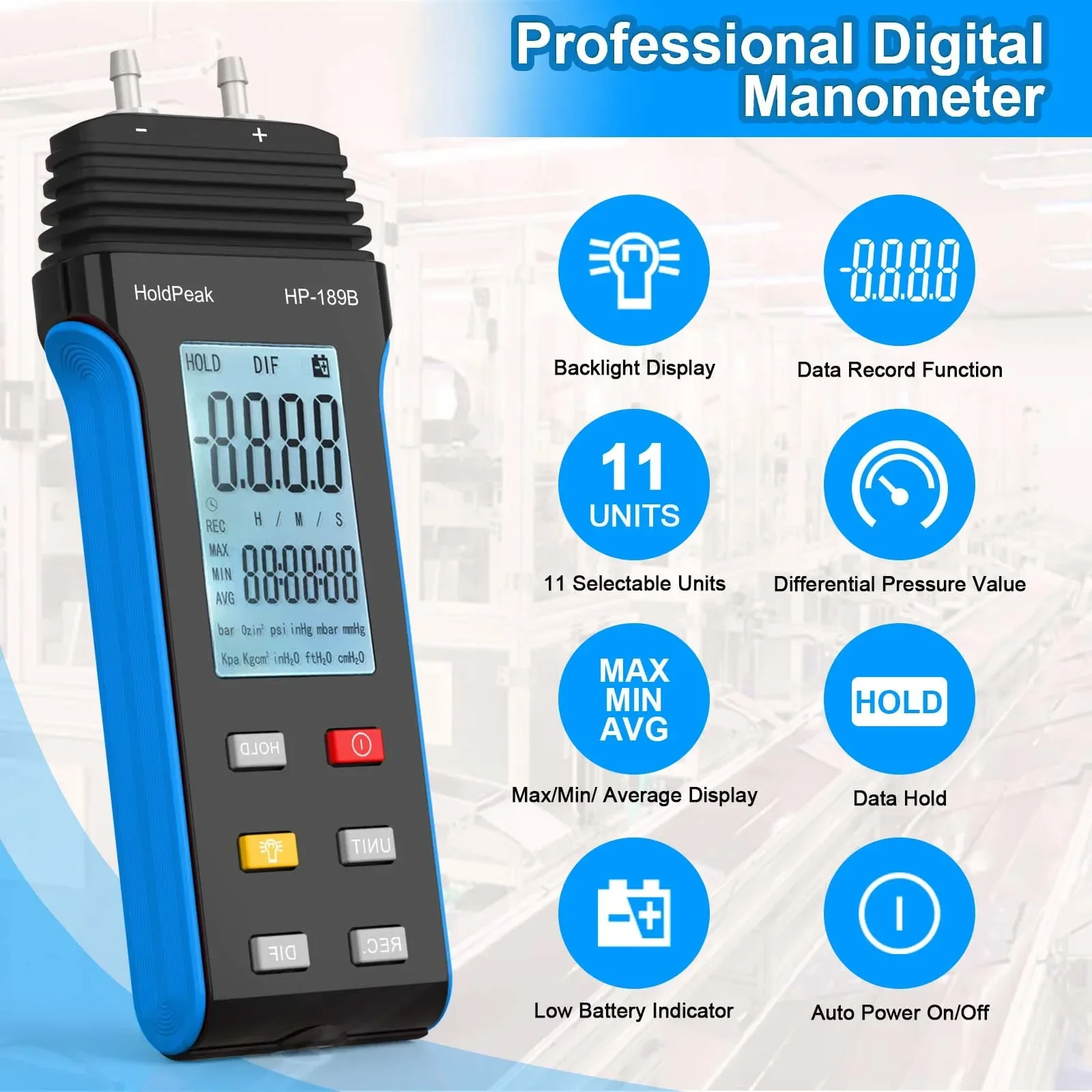 Holdpeak HP-189B Digital Manometer, LCD Display Dual-Port Gas Pressure Tester with Backlight for Pre...
