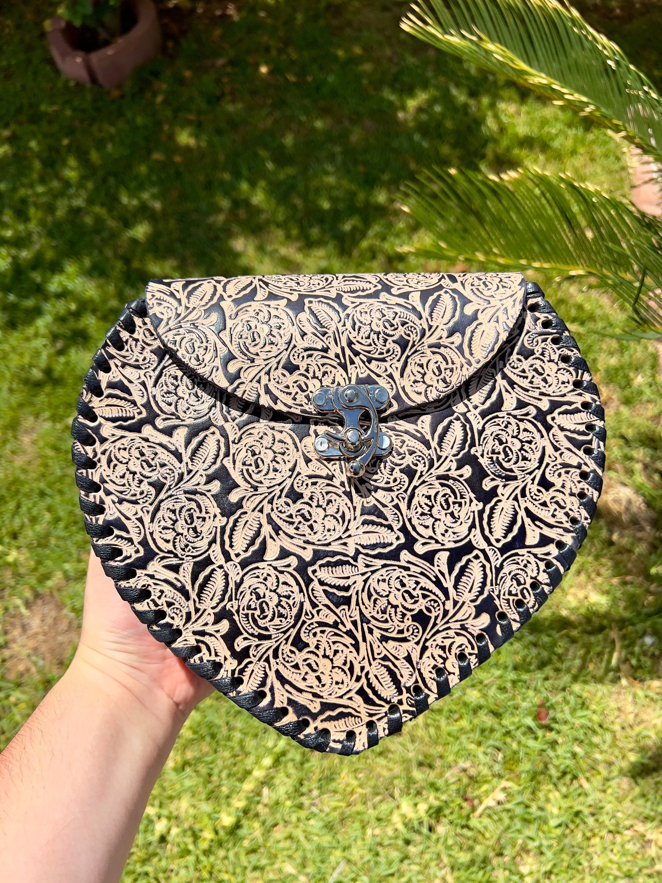 Mexican Leather bag, Heart Leather purse, Tooled Leather purse, Bol...