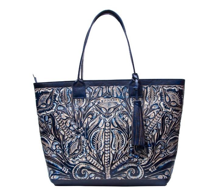 "This navy blue two toned hand tooled leather tote takes more than 72 hours of work. Floral des...