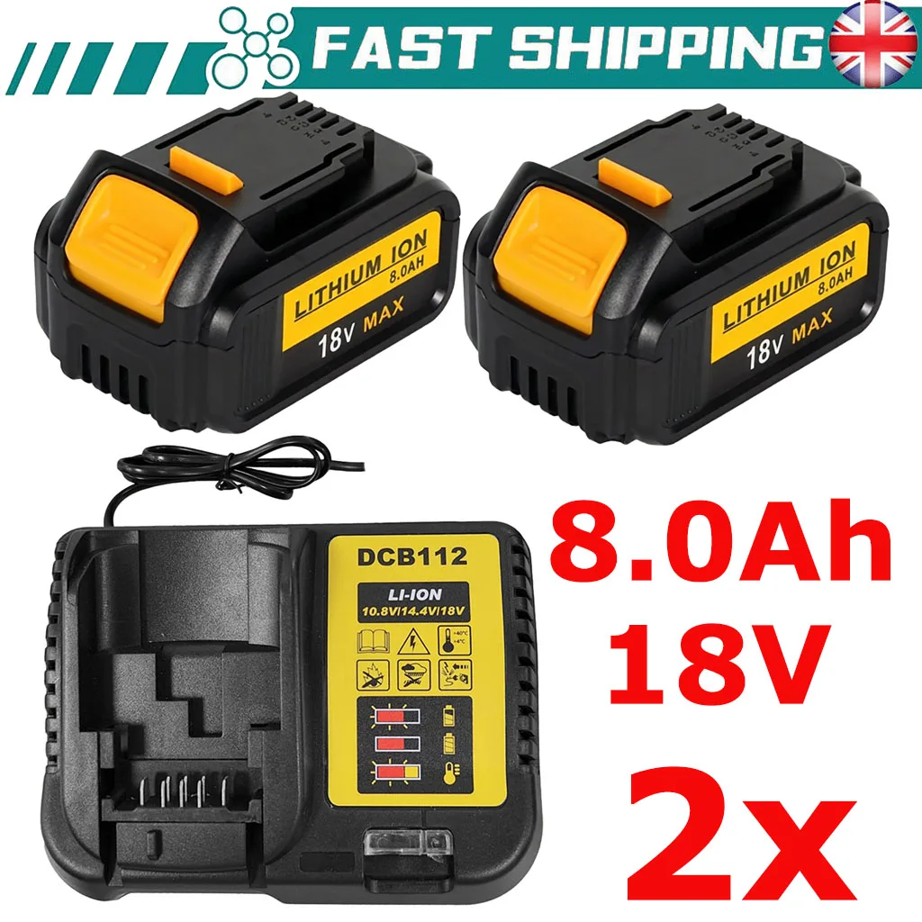 2xBattery For Dewalt 18v 8.0Ah +Charger Replace for 10.8V-18V Dewalt DCB112 DCB182 DCB200 DCB184 DCB...