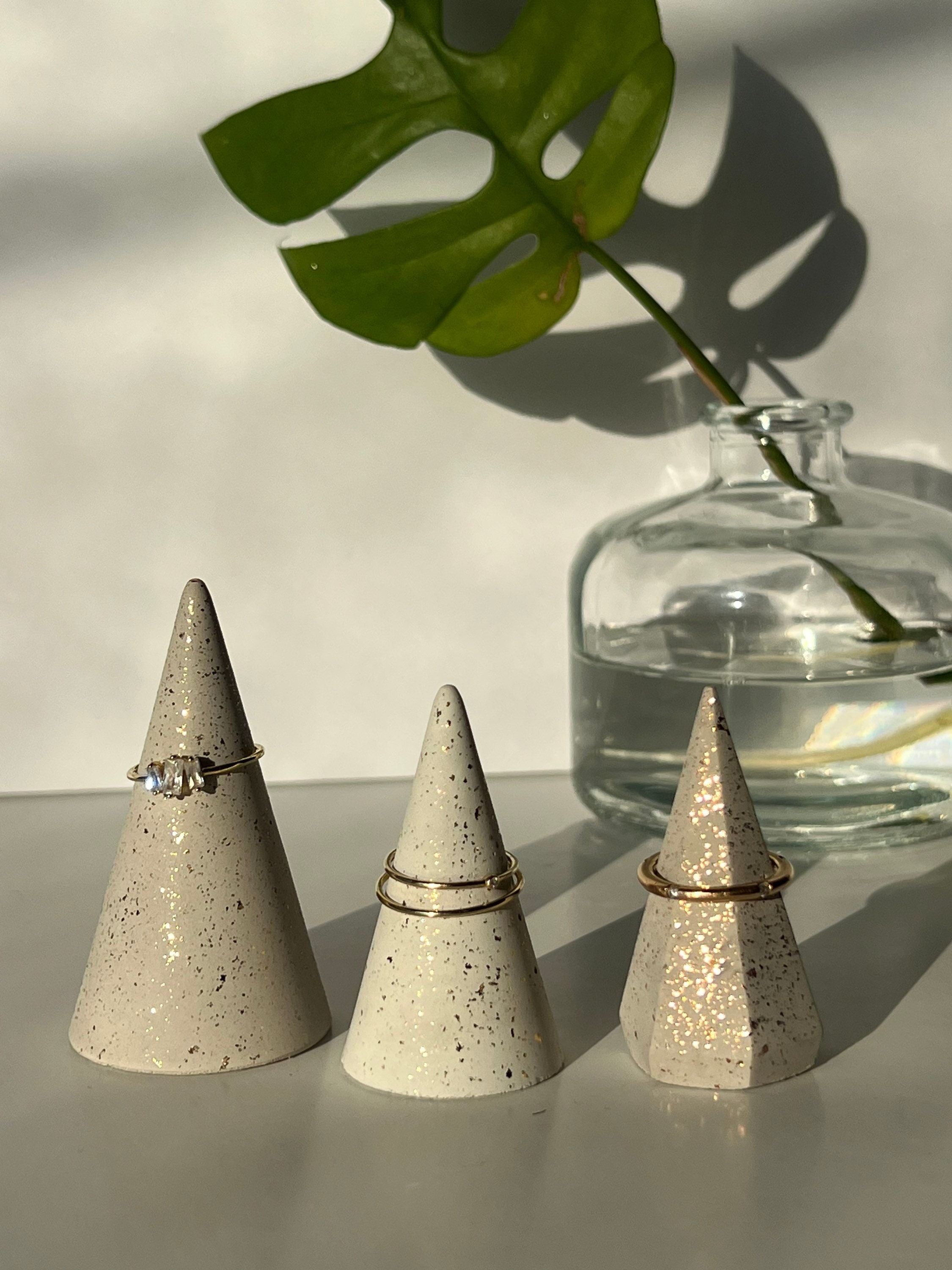 "My stardusted concrete ring cones sparkle SO beautifully when the light catches just right. Ea...