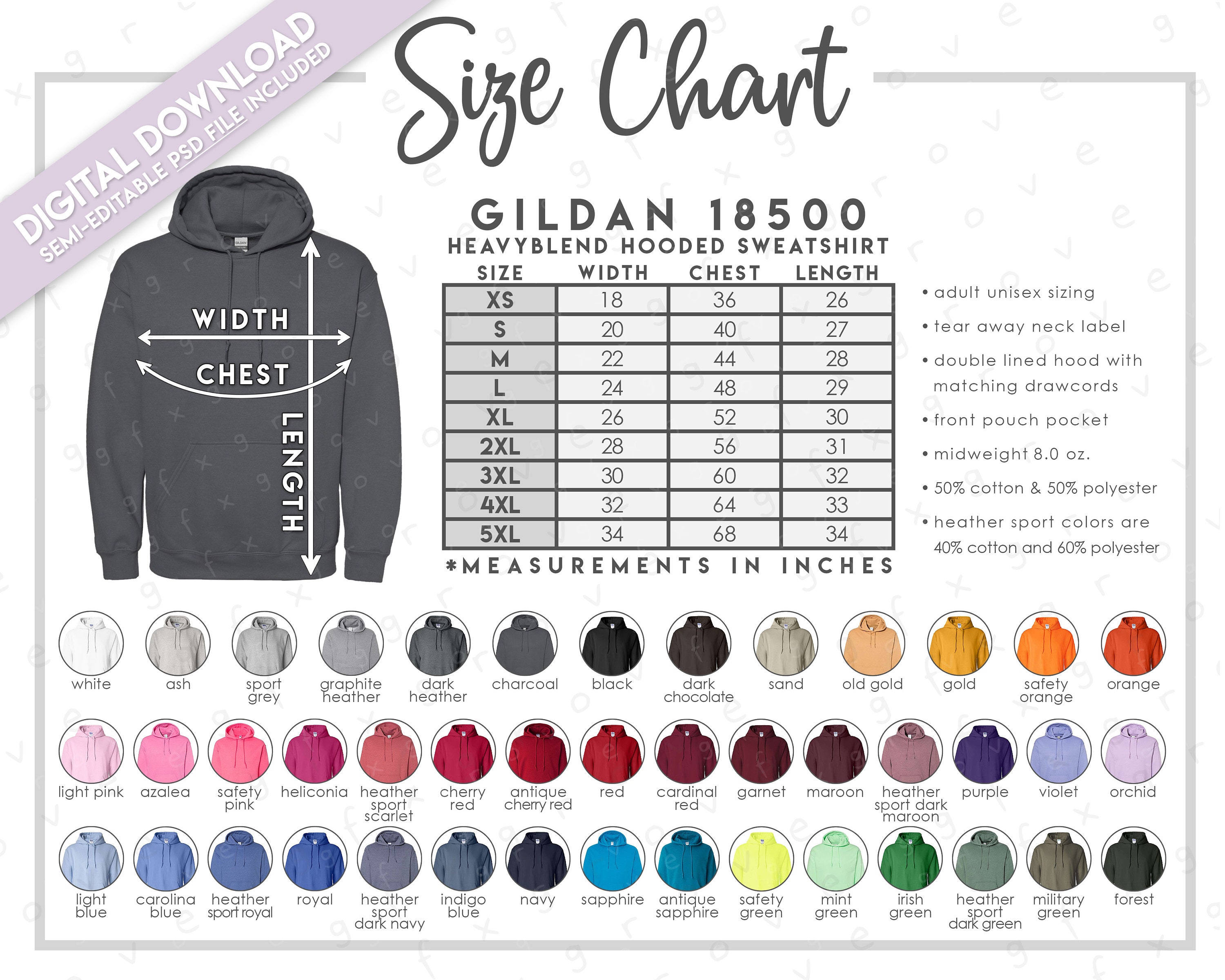 Semi-Editable Gildan 18500 Size Chart + Color Chart * Gildan Hoodie...