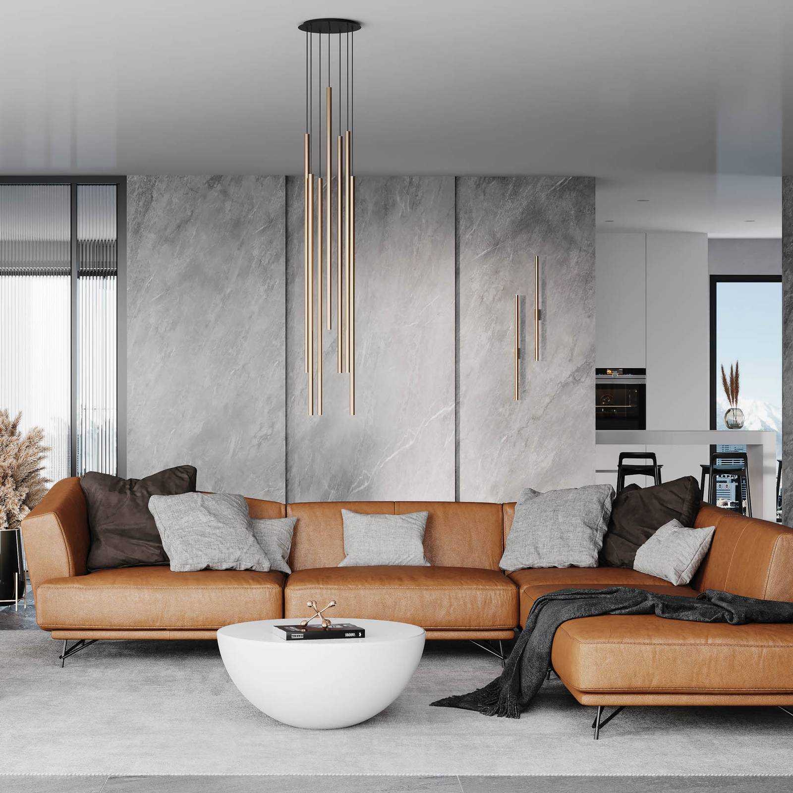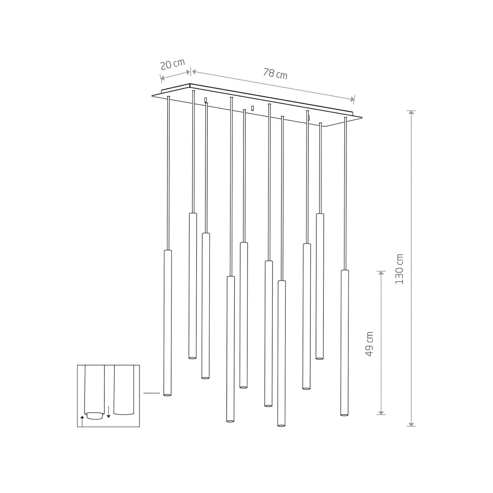 The Laser pendant light has seven tubular, narrow lampshades suspended from a round canopy. They pro...