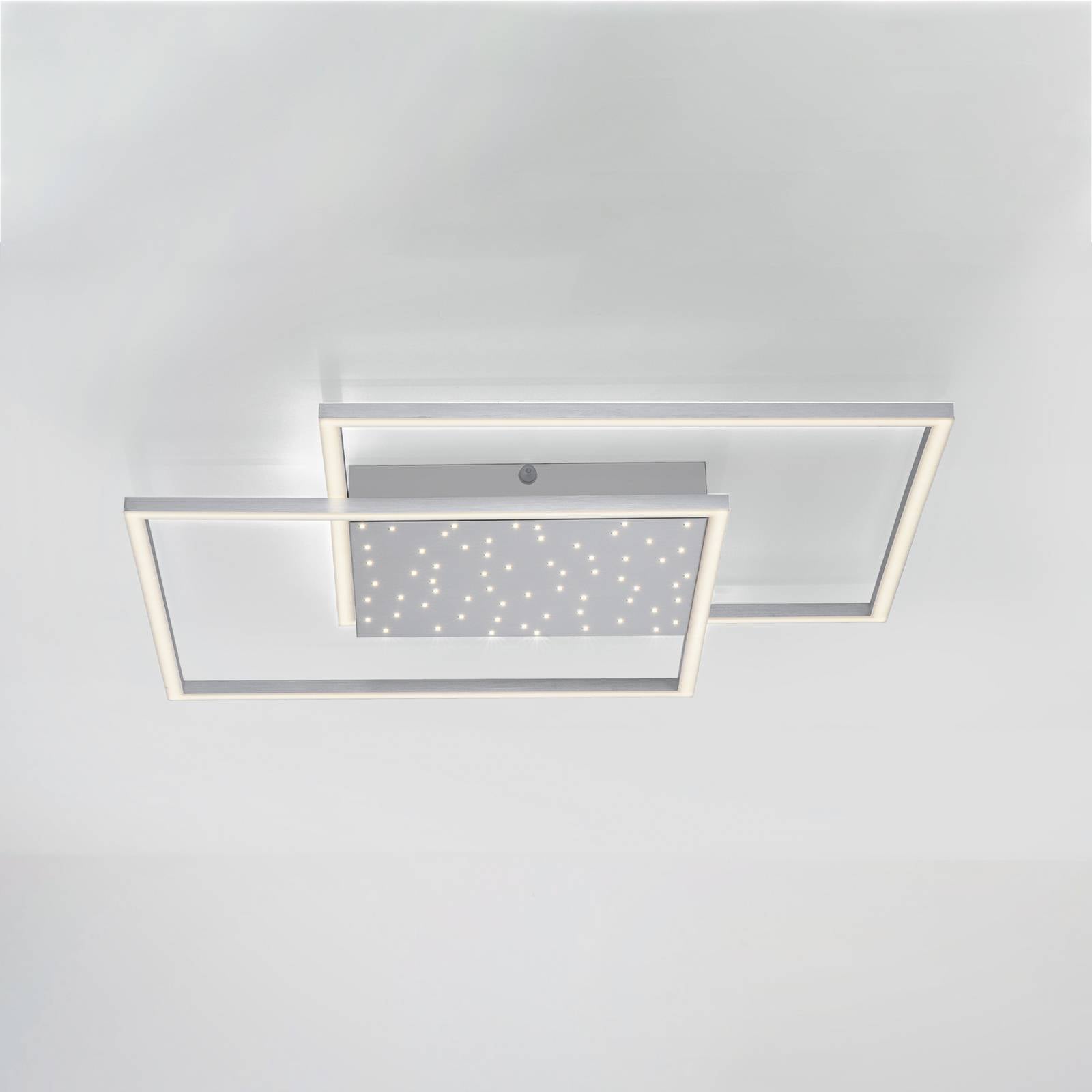 The Iven LED ceiling light is fitted with two square, LED-lit ceiling elements, one of which can be ...