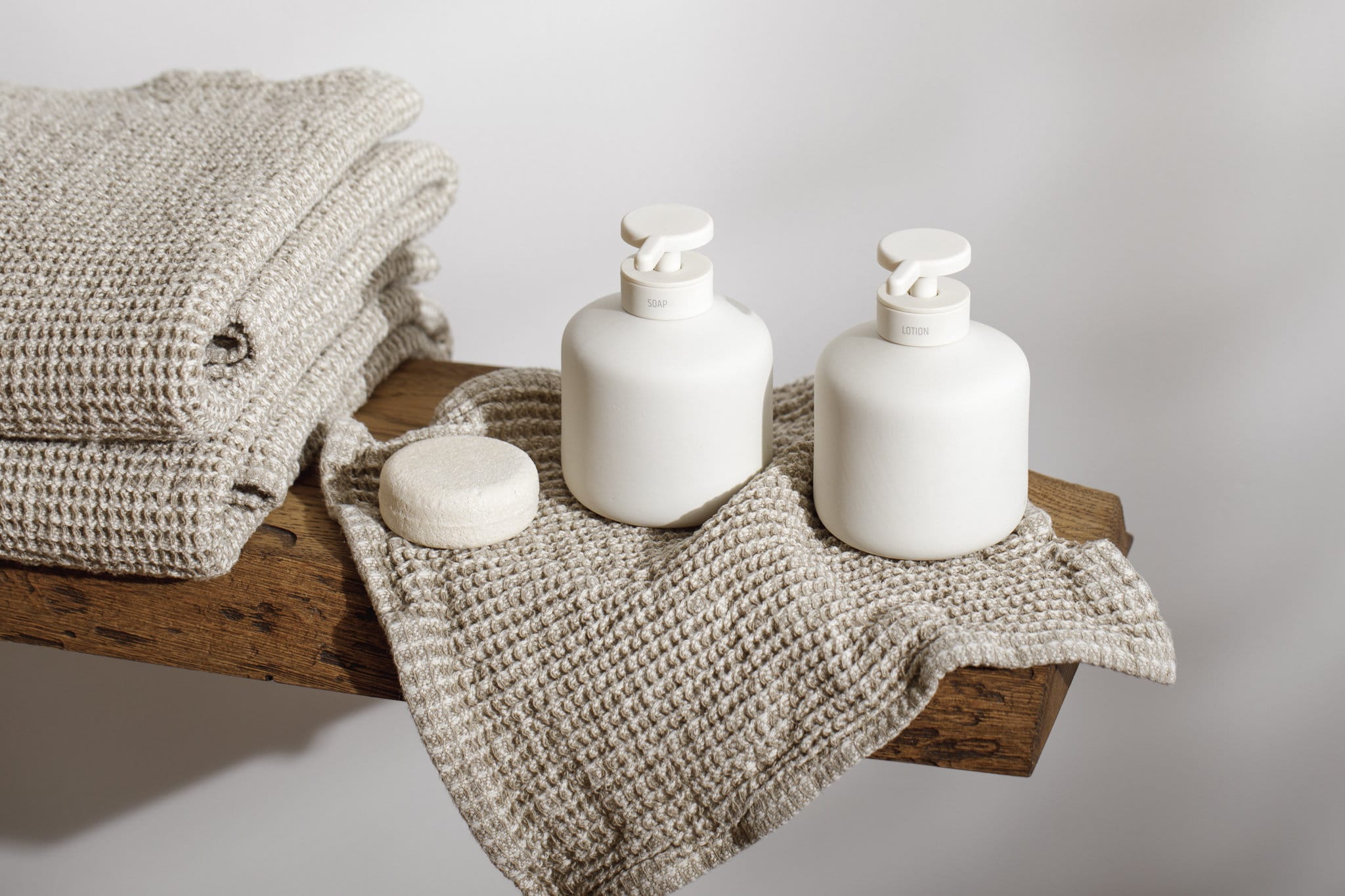 "Wrap yourself in the luxurious embrace of our lightly exfoliating waffled linen towels and tra...