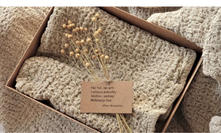 "Natural linen face, hand and bath towels are decorated with a beautiful black waffle pattern. ...