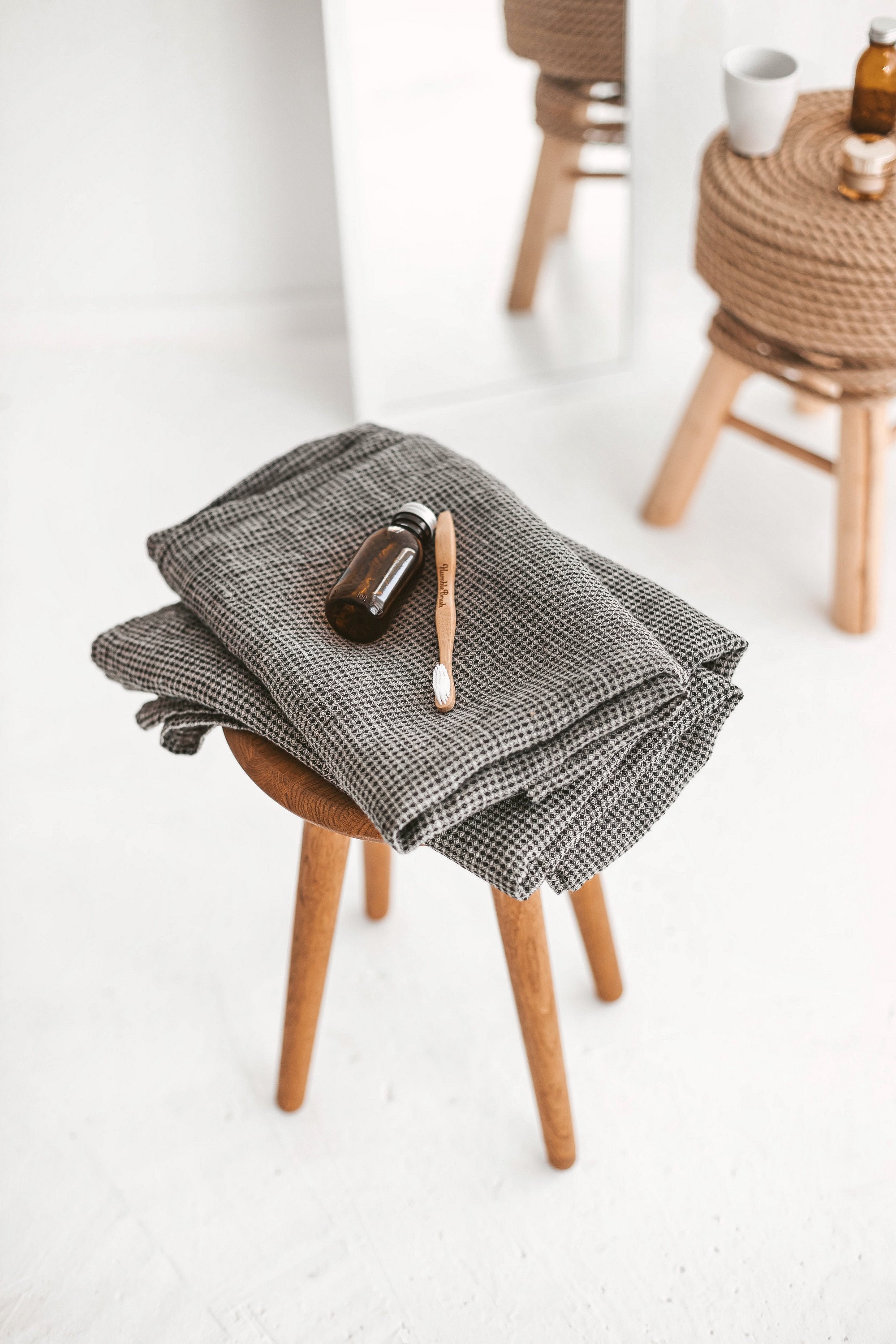 Natural linen black waffle bath towel. Large organic linen bath, ha...