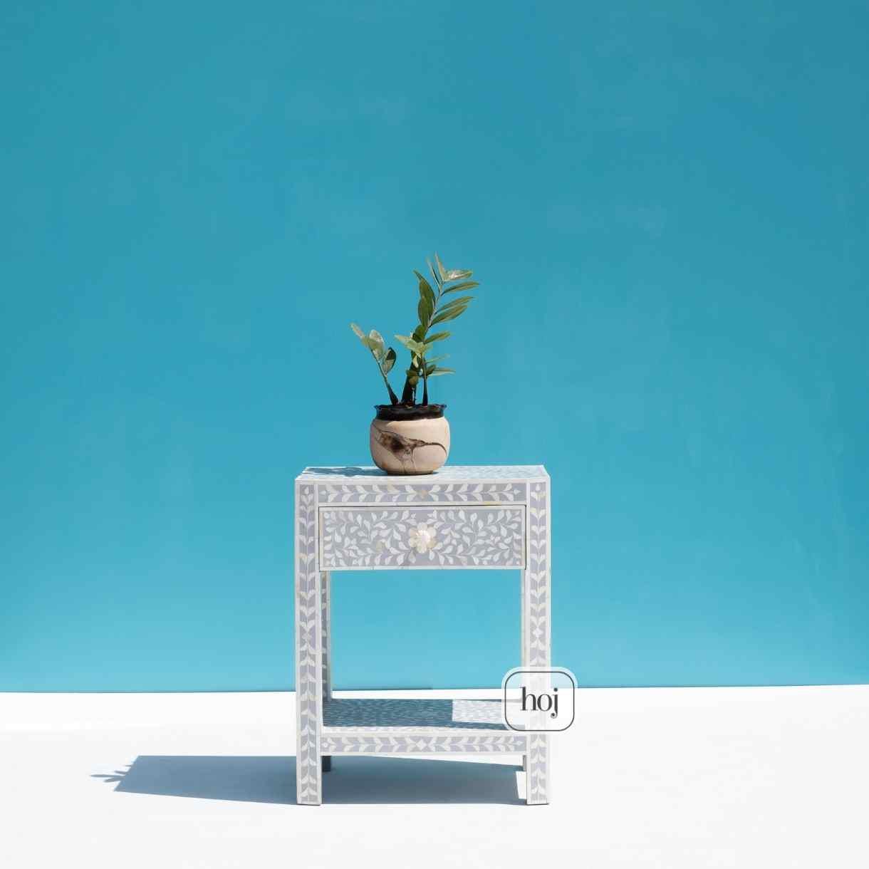 Gray Floral Bone Inlay Side Table with Storage, Bedside Table, Bone...
