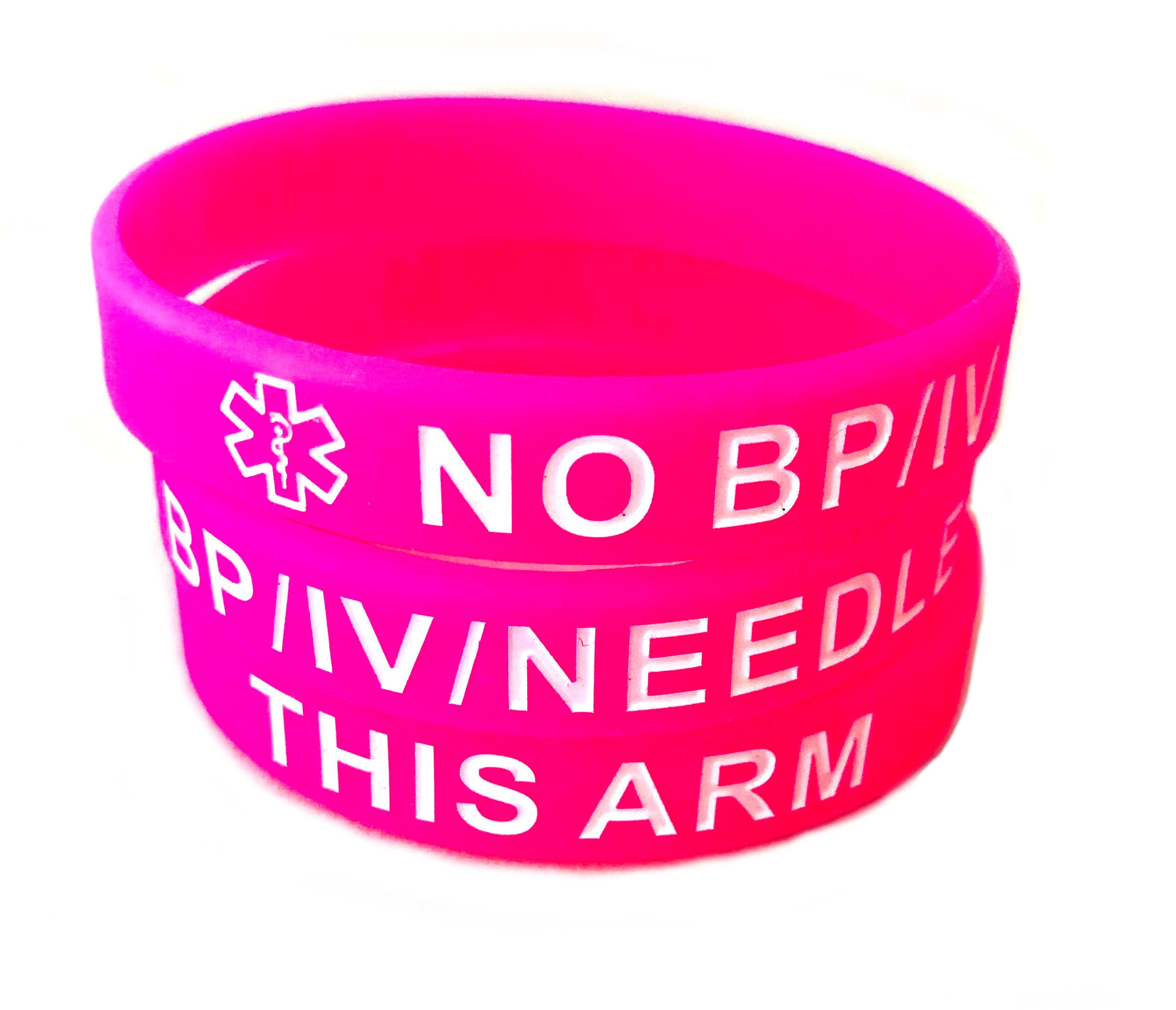 "Hot Pink, Silicone Medical Id Bracelet. Each bracelet states: NO BP/IV/OR NEEDLES * THIS ARM *...