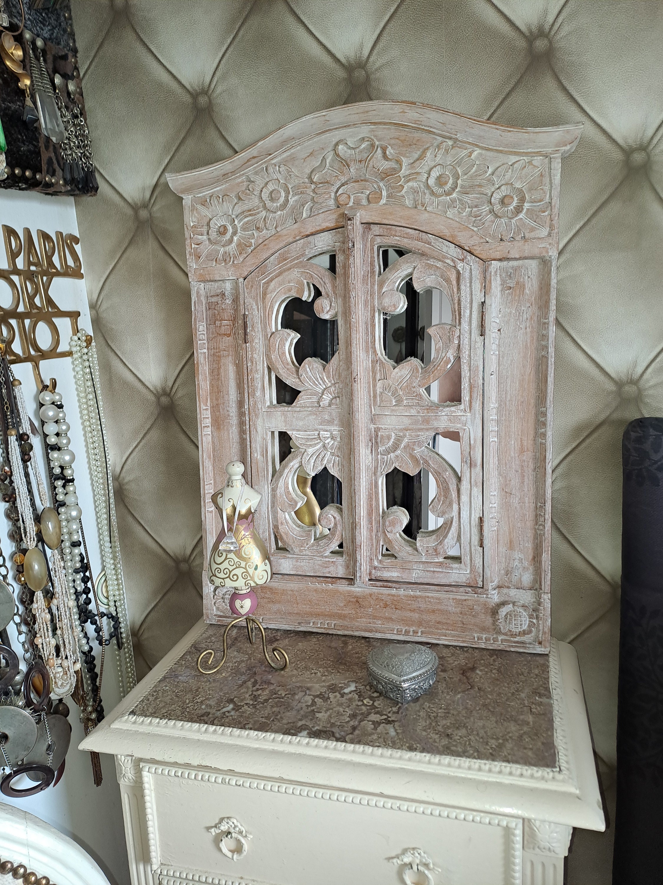 White wood carved mandala mirror 1990 / wooden wall decoration object / Trompe l'oeil carved mirror ...