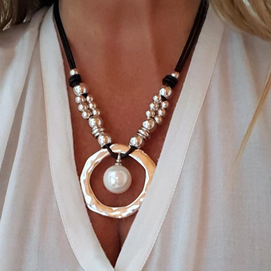 "Leather Necklace with Endless Ring & Custom Pearl - Statement Pendant Necklace in UNOde50 ...
