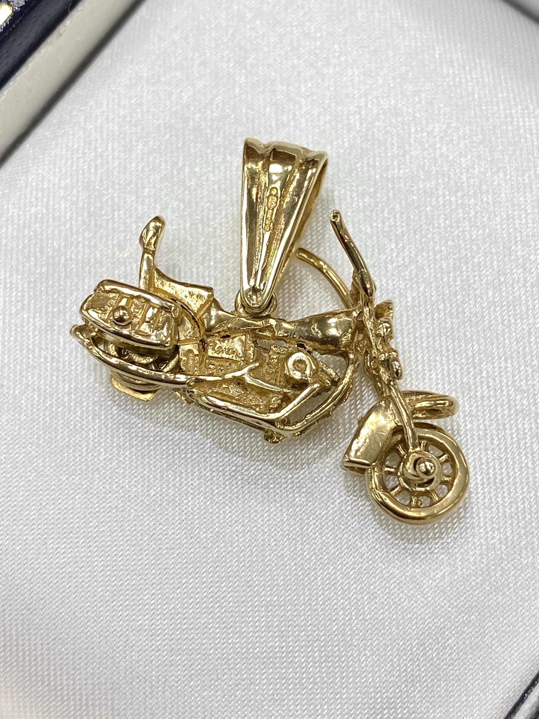 This amazing motorbike pendant is beautifully hand crafted from 9ct yellow gold and includes moveabl...