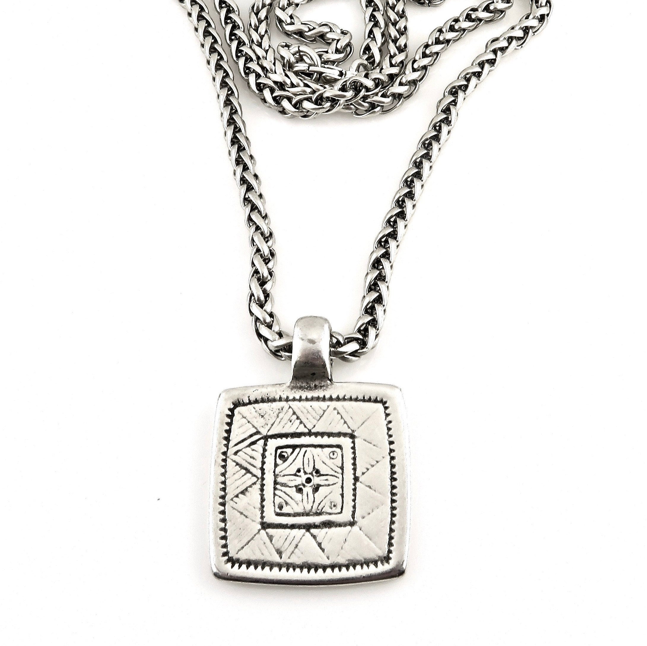 Chunky silver etched square pendant on a chunky silver wheat chain Sterling silver plated chain and ...