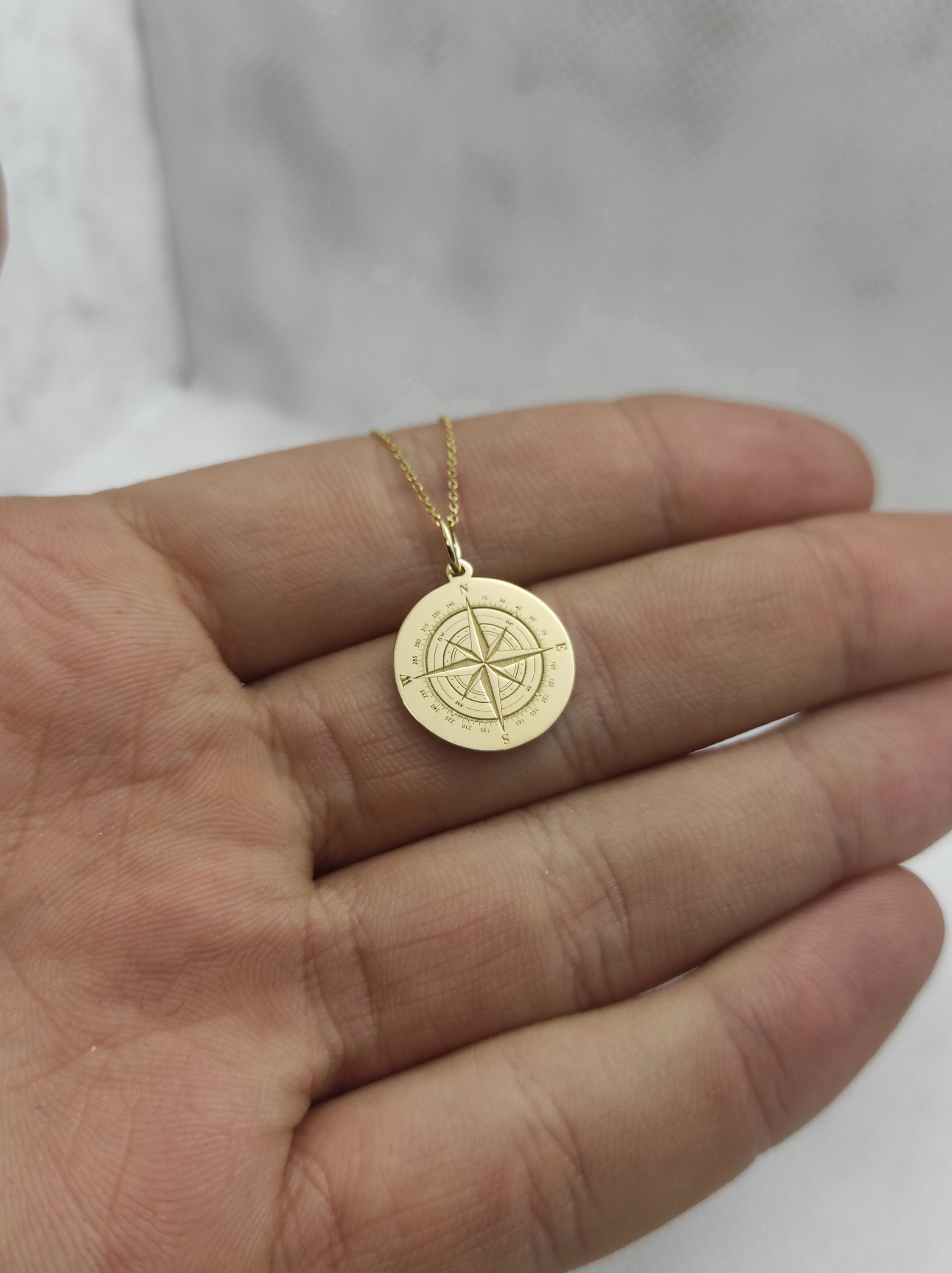 14K Solid Gold Compass Pendant, Personalized Compass Jewelry, Daint...