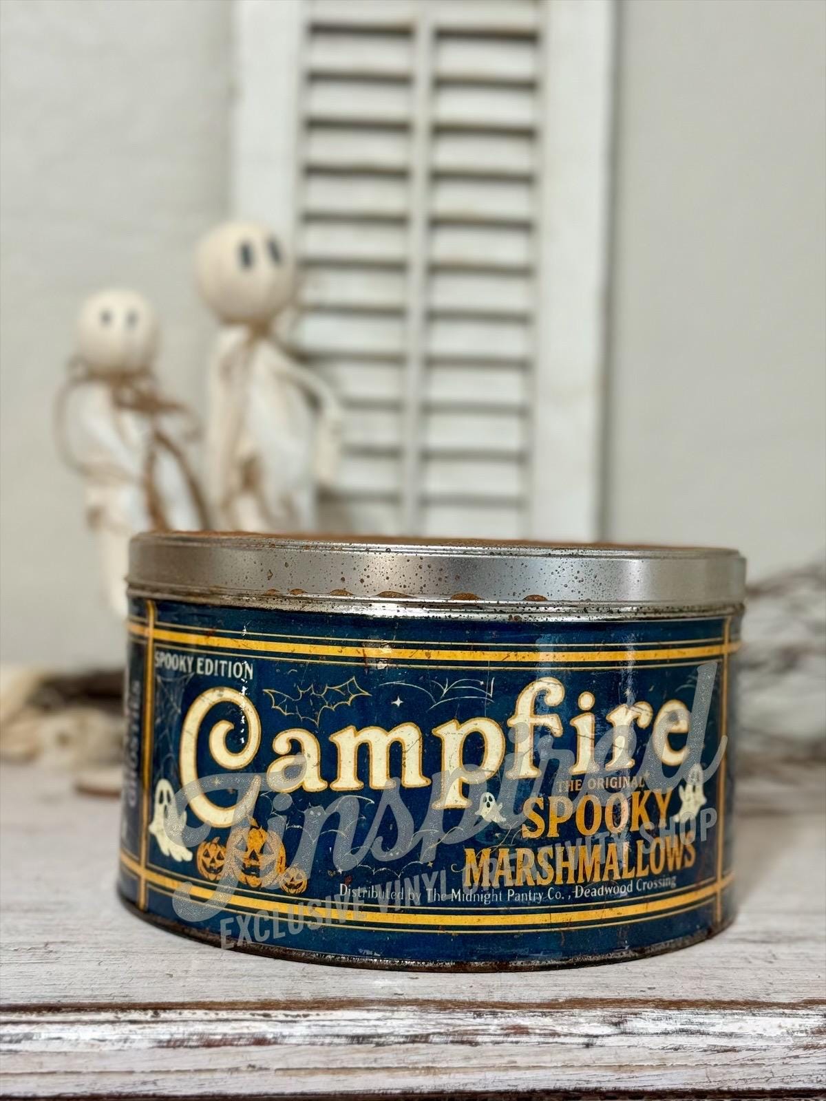 Bring vintage Halloween charm into your home with this handmade black Campfire Marshmallows tin. Fea...