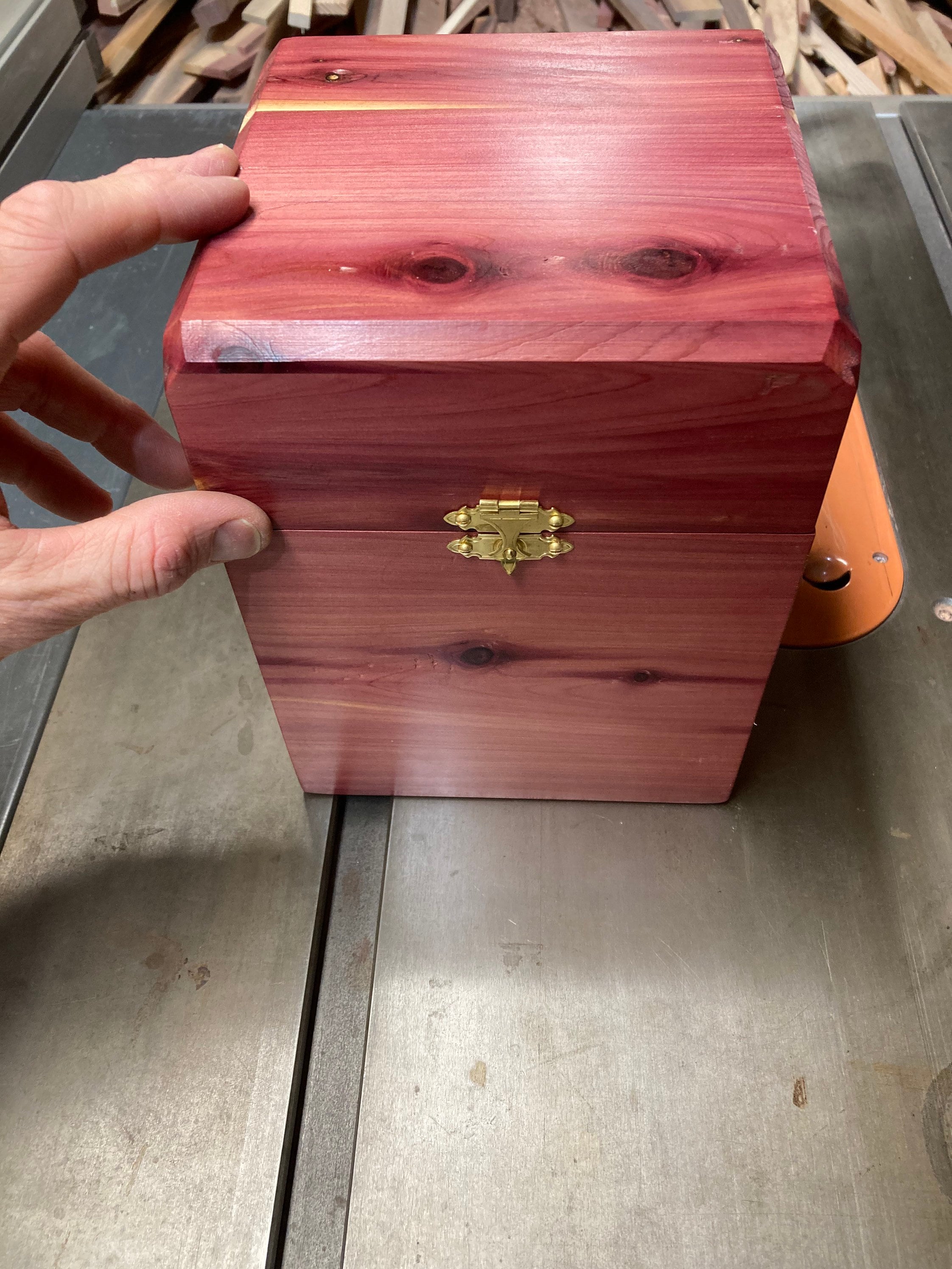 "Eastern Red Cedar desktop storage box, with hinged top and la...