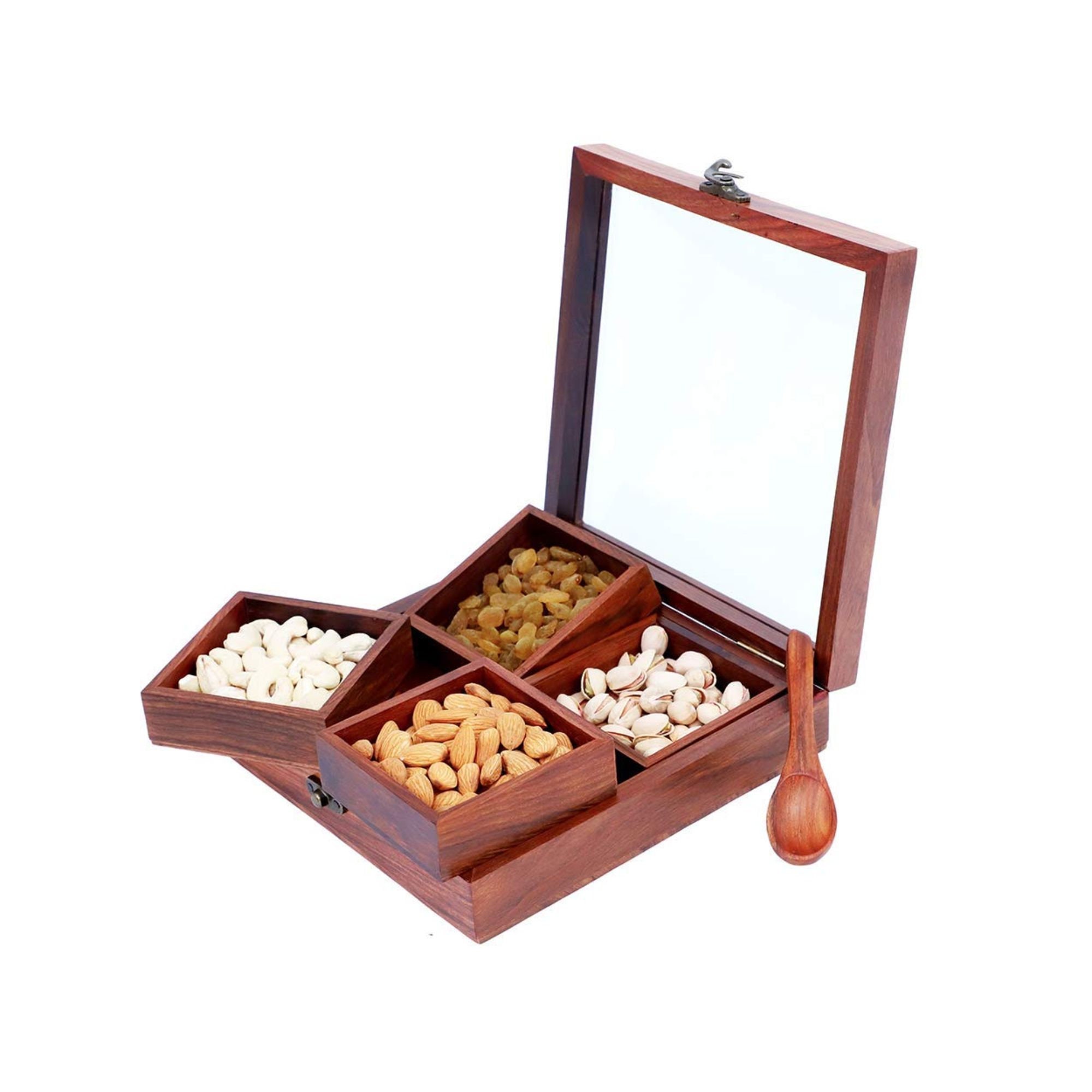 Handmade Dry Fruit Box Wooden Box with 4 Removable Dry Fruits Conta...