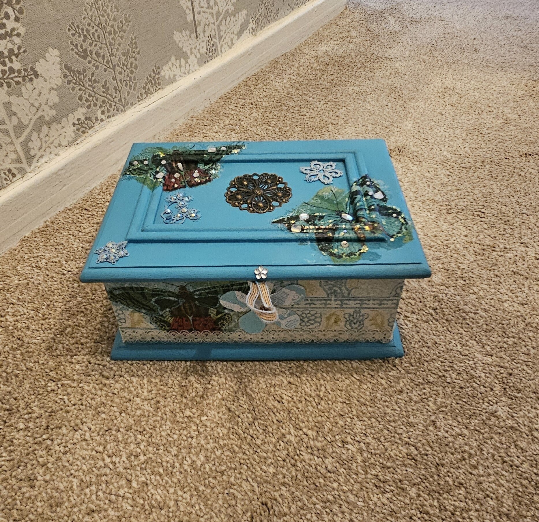 This enchanting hand made box is painted in a beautiful ocean blue colour, enhanced with paint inlay...