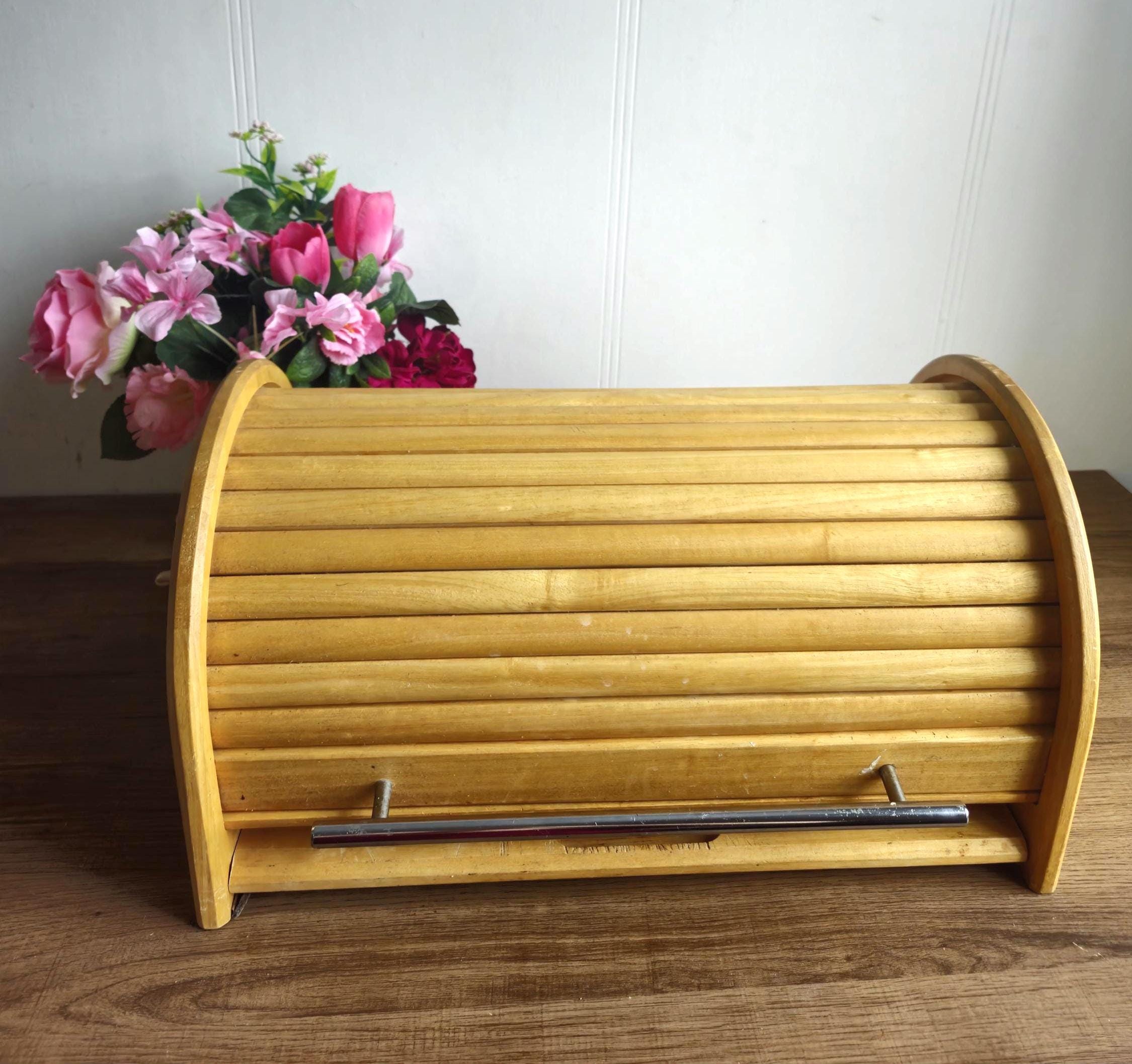 Vintage Wood Bread Box, Wooden Breadbox, Large Wooden Bread Box, Roll Top Bread Box, Rustic Bread Bo...