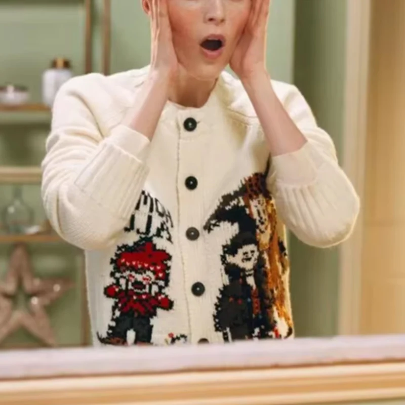 Women's Jacket 2025 Winter New White Long-Sleeve Home Alone Print Christmas Knit Cardigan Fashionabl...
