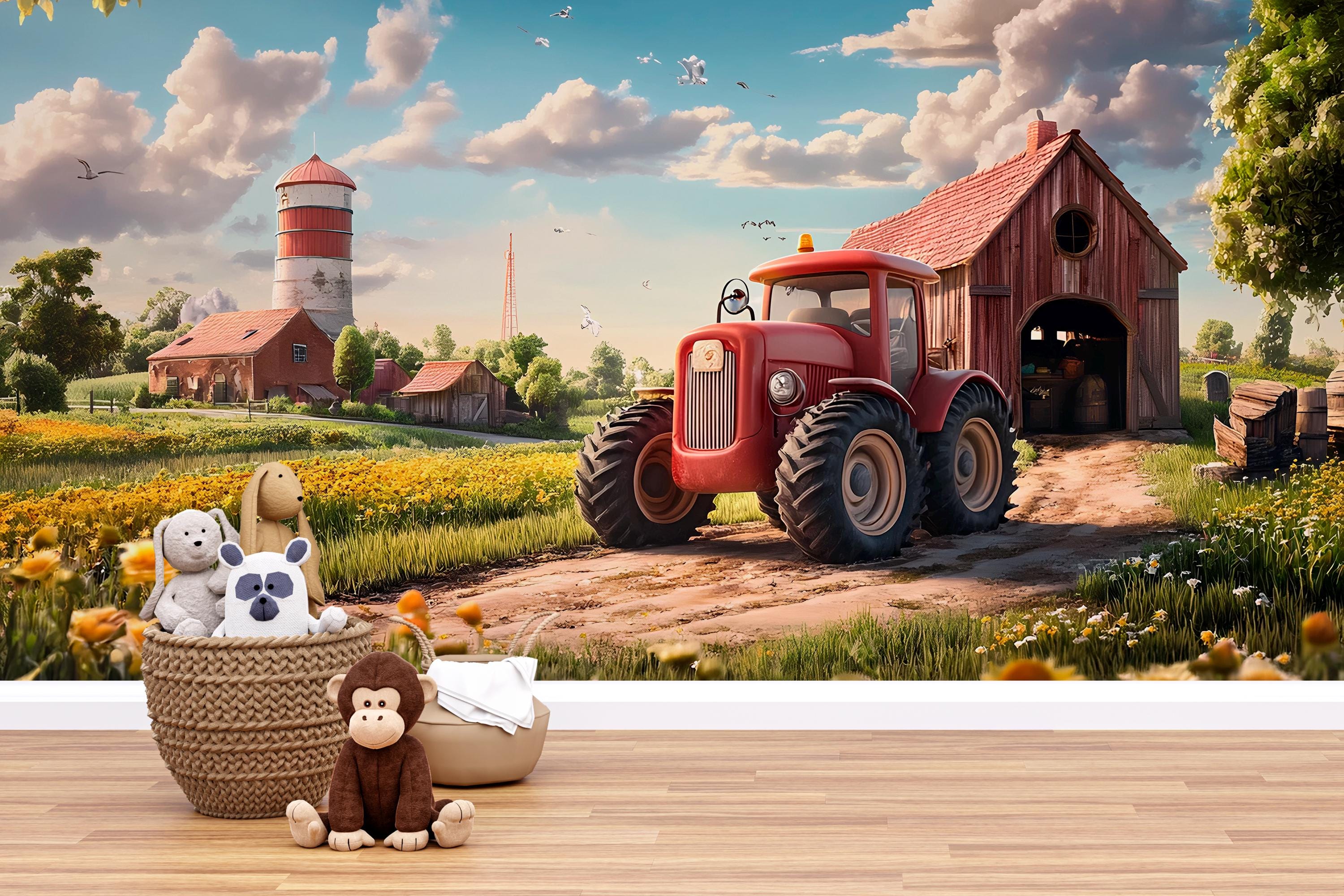 Farm Tractor Wall Mural - Kids Room Decor, Barn & Field Theme Wallpaper, Country Nursery Art, Re...