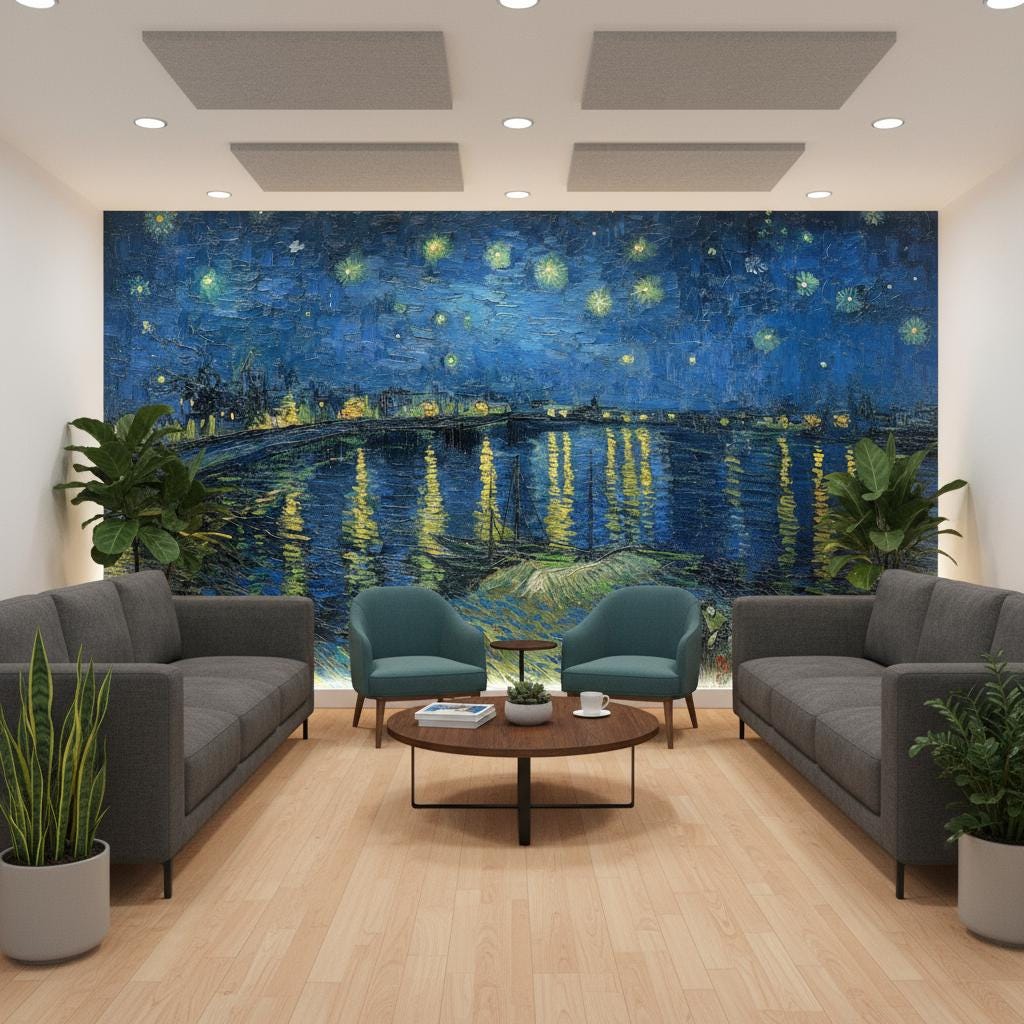 Transform your space with this printed wallpaper mural of Van Gogh's Starry Night Over the Rhô...