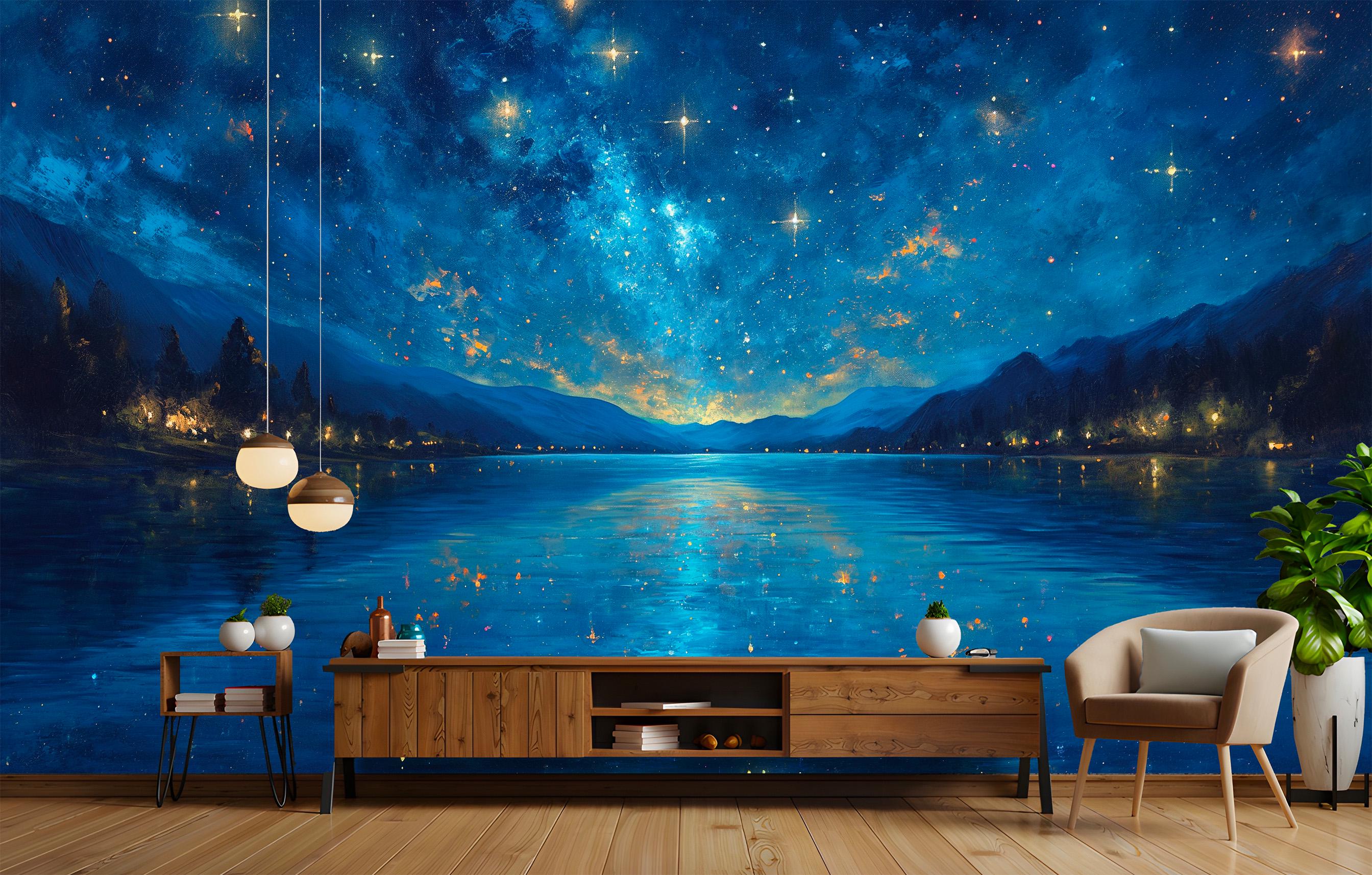 Starry Night Lake Wallpaper Mural - Peel and Stick Removable Wall Art | Non-Woven Night Sky with Sta...