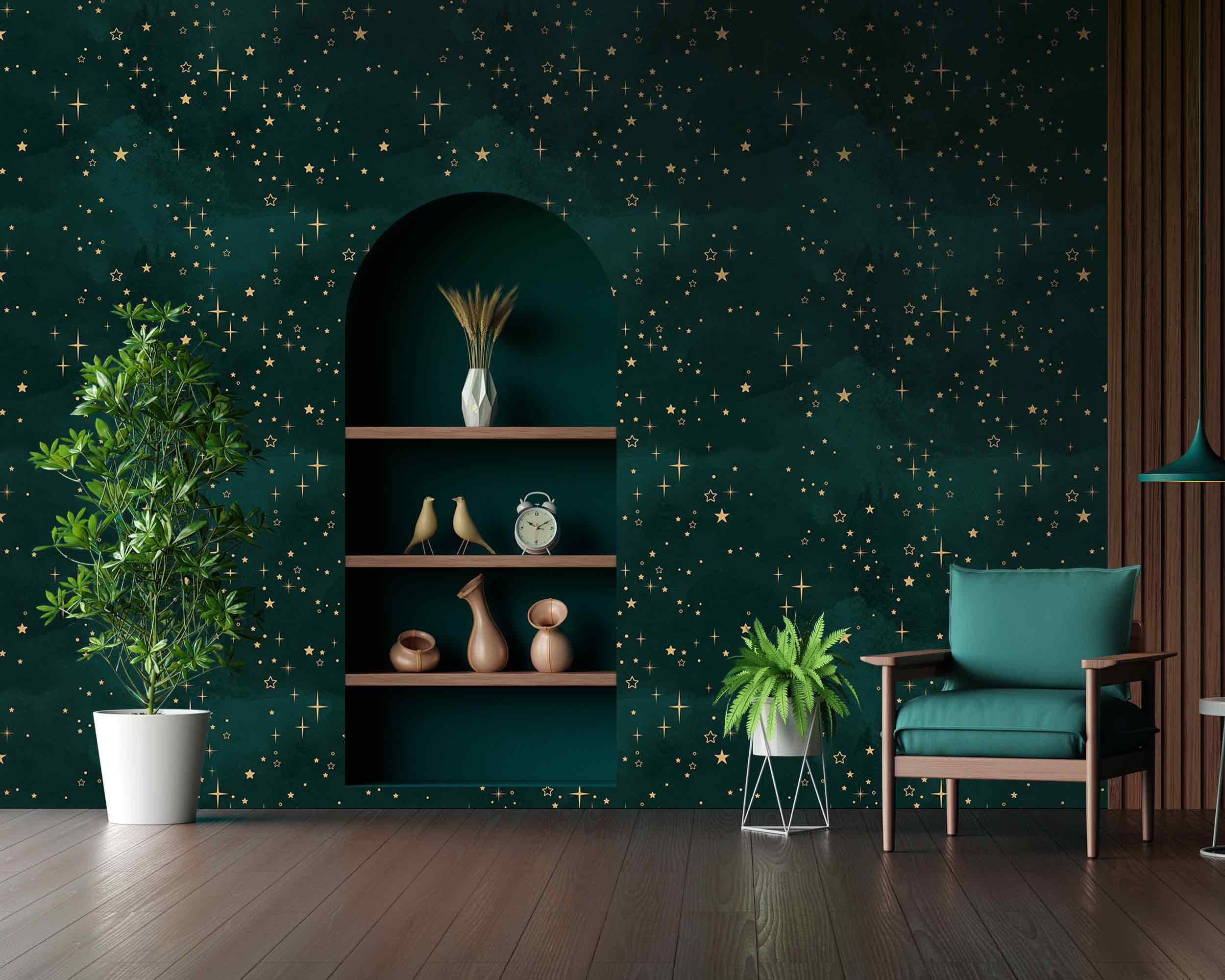 Emerald Starry Night Wall Mural Celestial Wallpaper Cosmic Sky Deco...