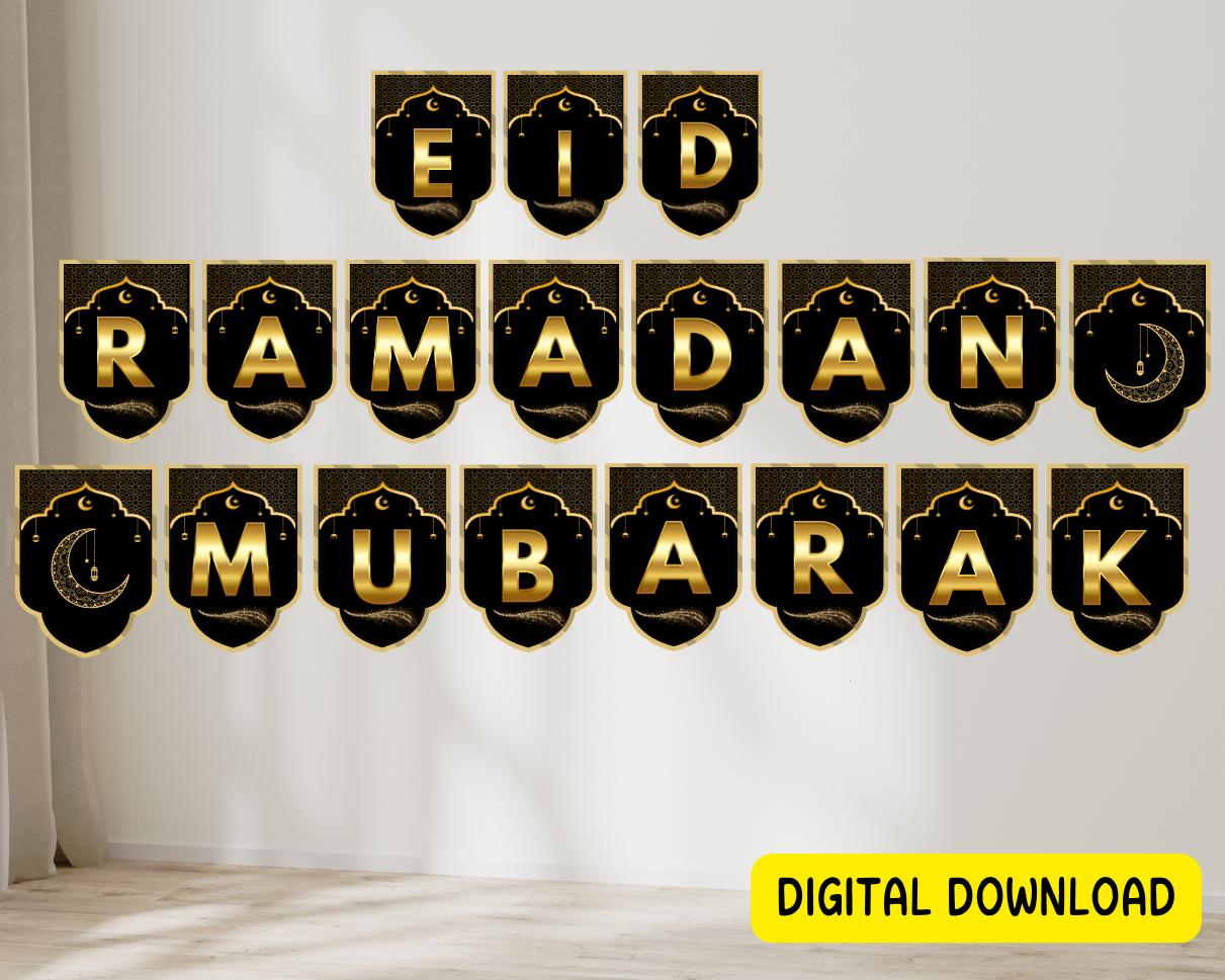 Decorate your home for Ramadan with this classic Black and gold themed Ramadan/Eid Mubarak Banner. G...