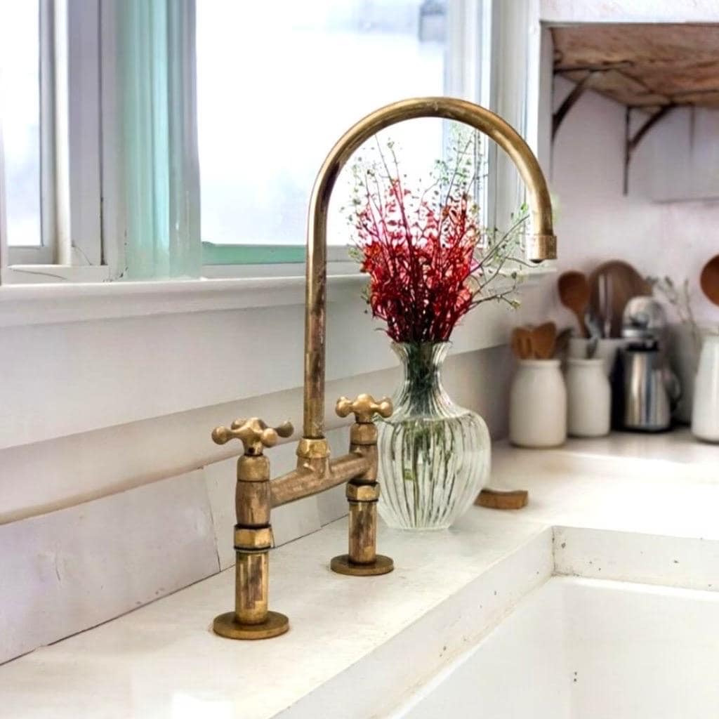 "Our solid Brass Bridge Kitchen Faucet is a handcrafted masterpiece that blends vintage charm w...