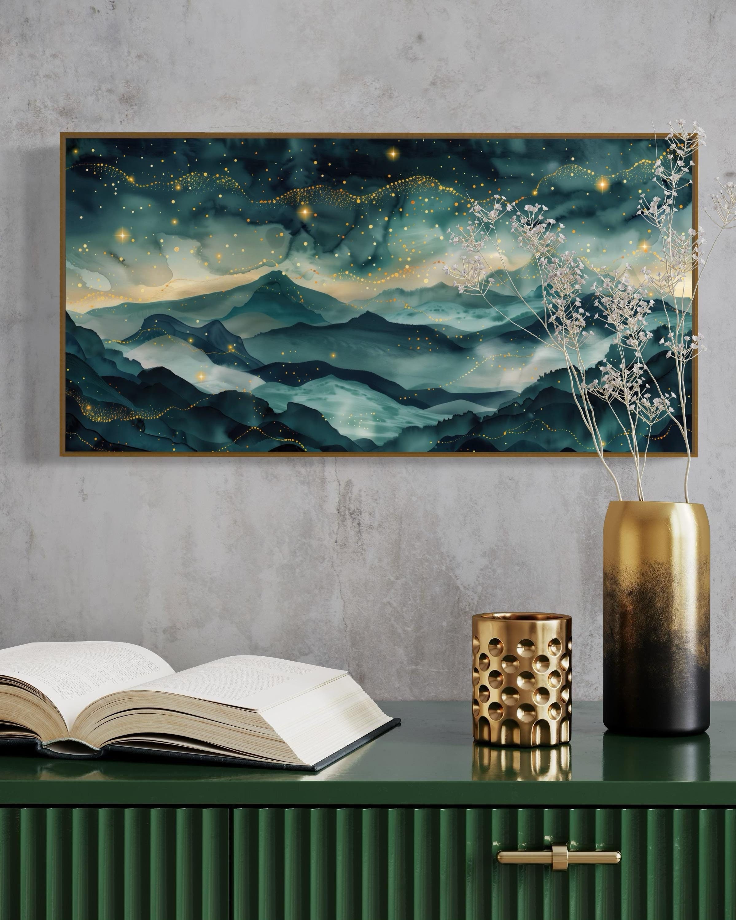 • Dreamy Starry Night - Mystical Mountain Art Print for Home Decore, ...