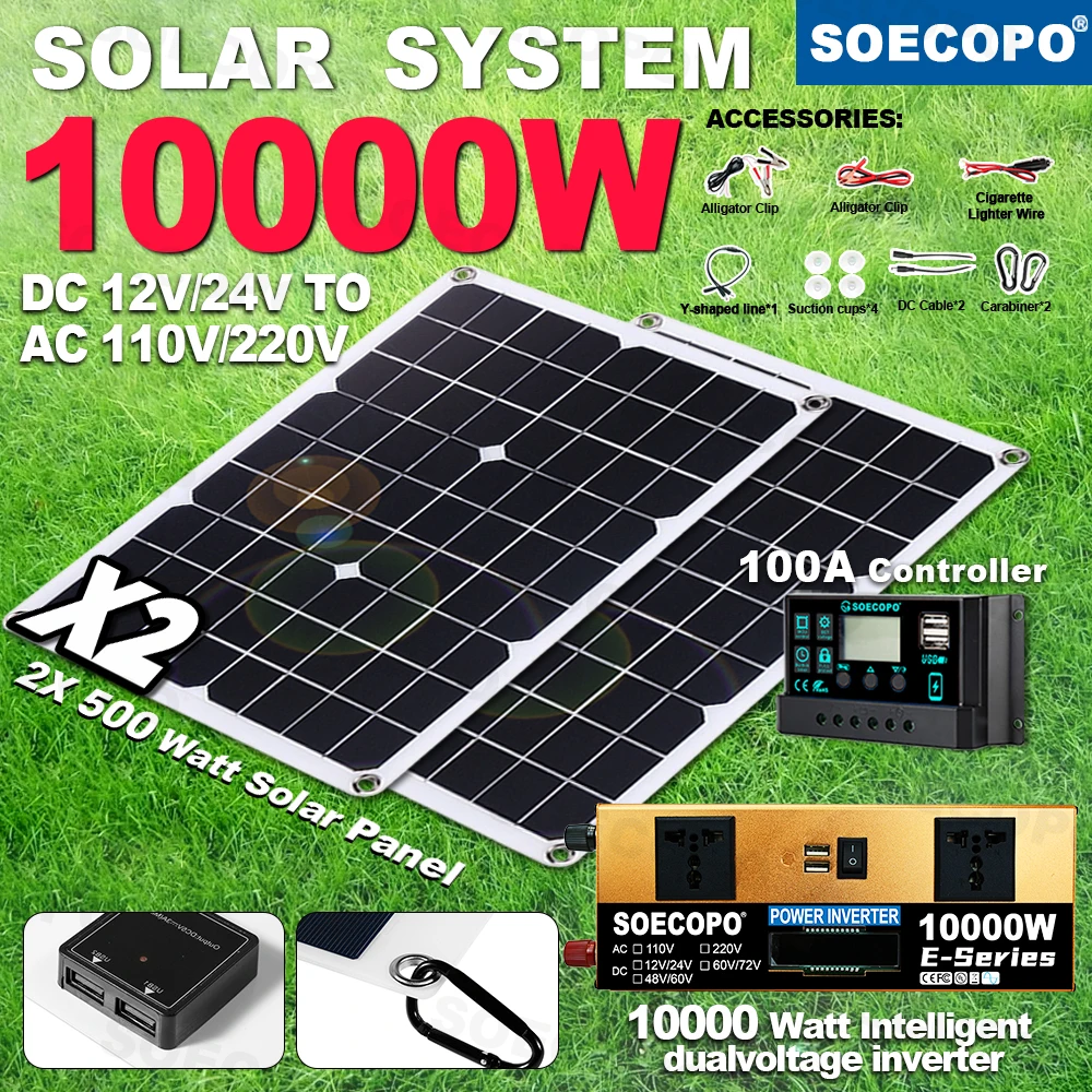 SOECOPO 10000W Complete For Home Camping Solar Kit 2×500W Panels 12V/24V To 110V/220V Two Outl...