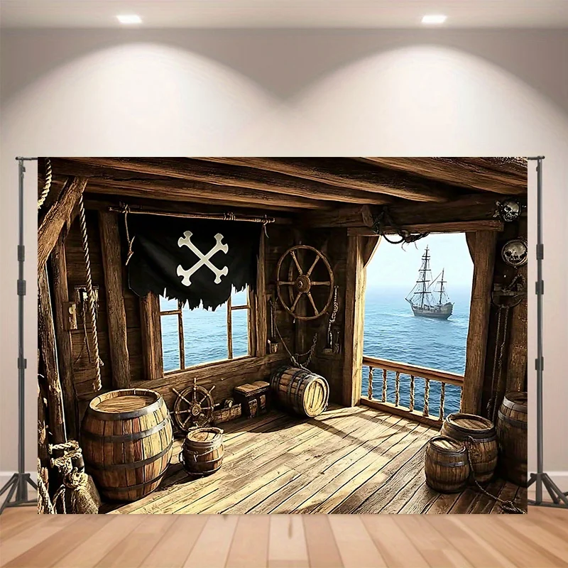 1pc Pirate Ship cabin polyester banner - Wooden interior with sail, bucket, skull flag - perfect for...