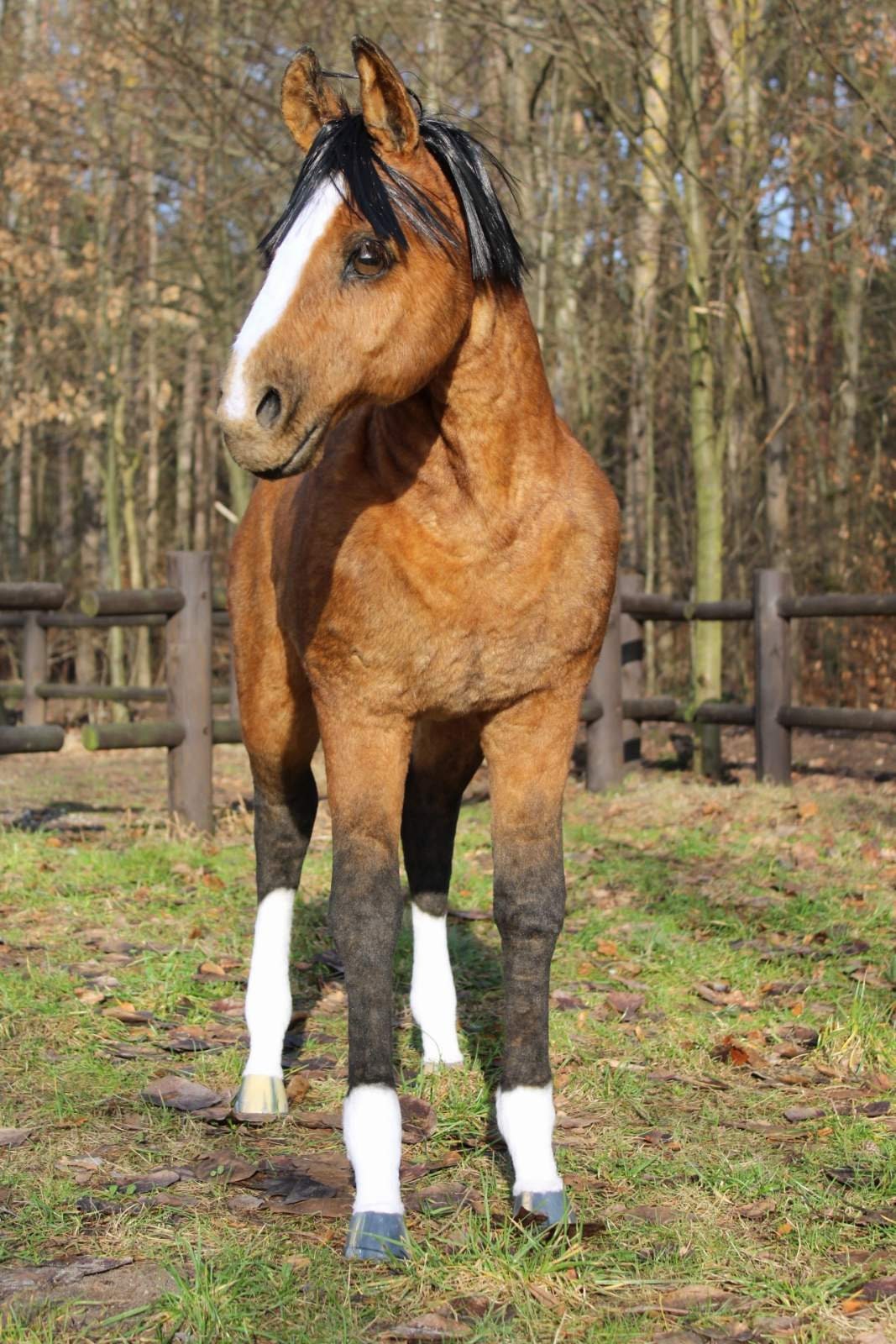 A lifelike, full-scale faux-taxidermy horse sculpture made of high-quality faux fur, standing outdoo...