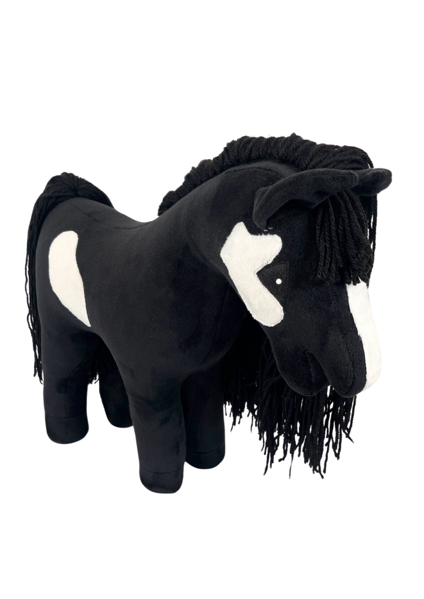 "This beautiful hobby horse mascot has a black head and mane, white blaze and brown eyes, finis...