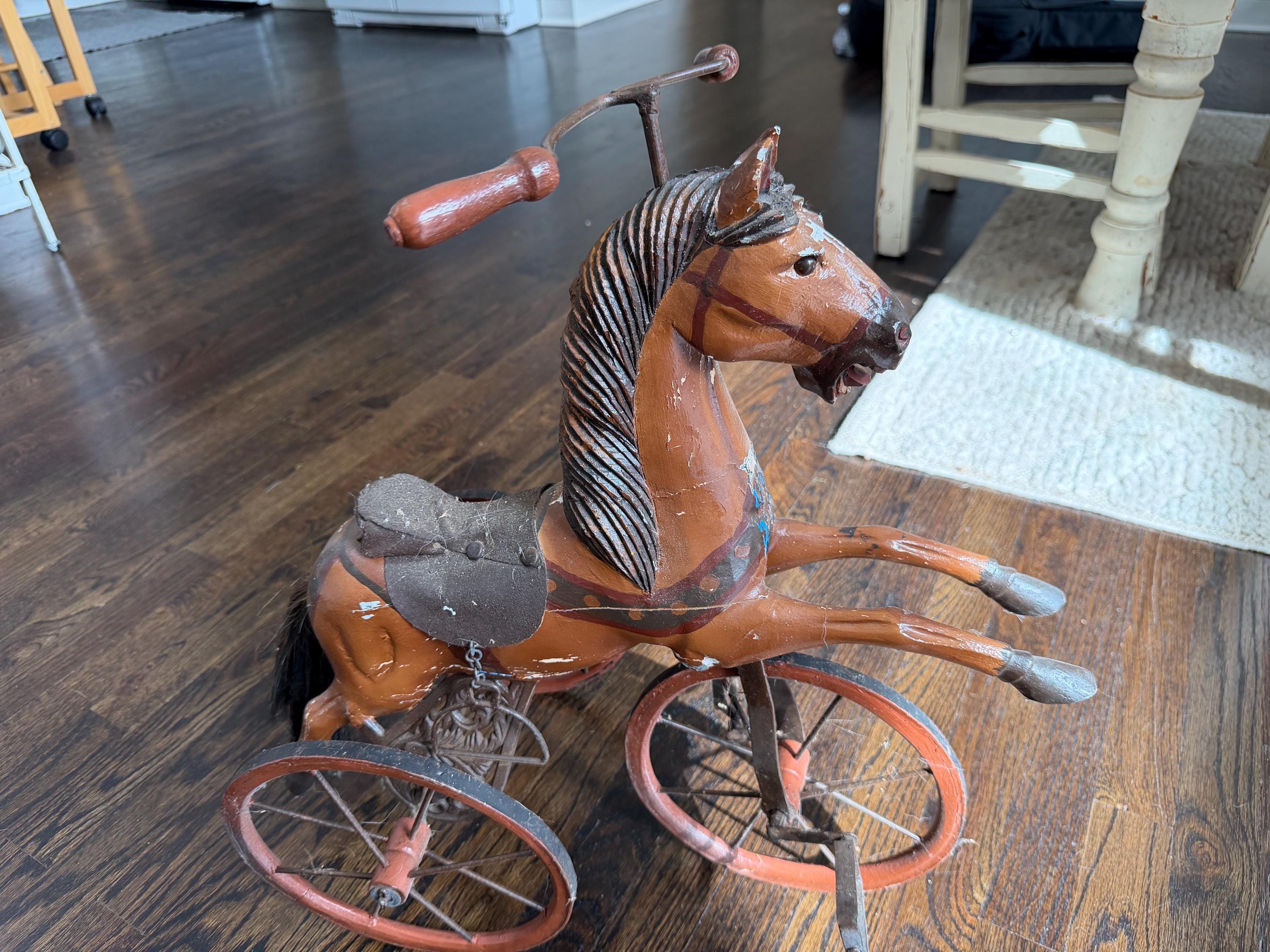 Antique Wooden Horse Tricycle Hand Carved And Painted Working