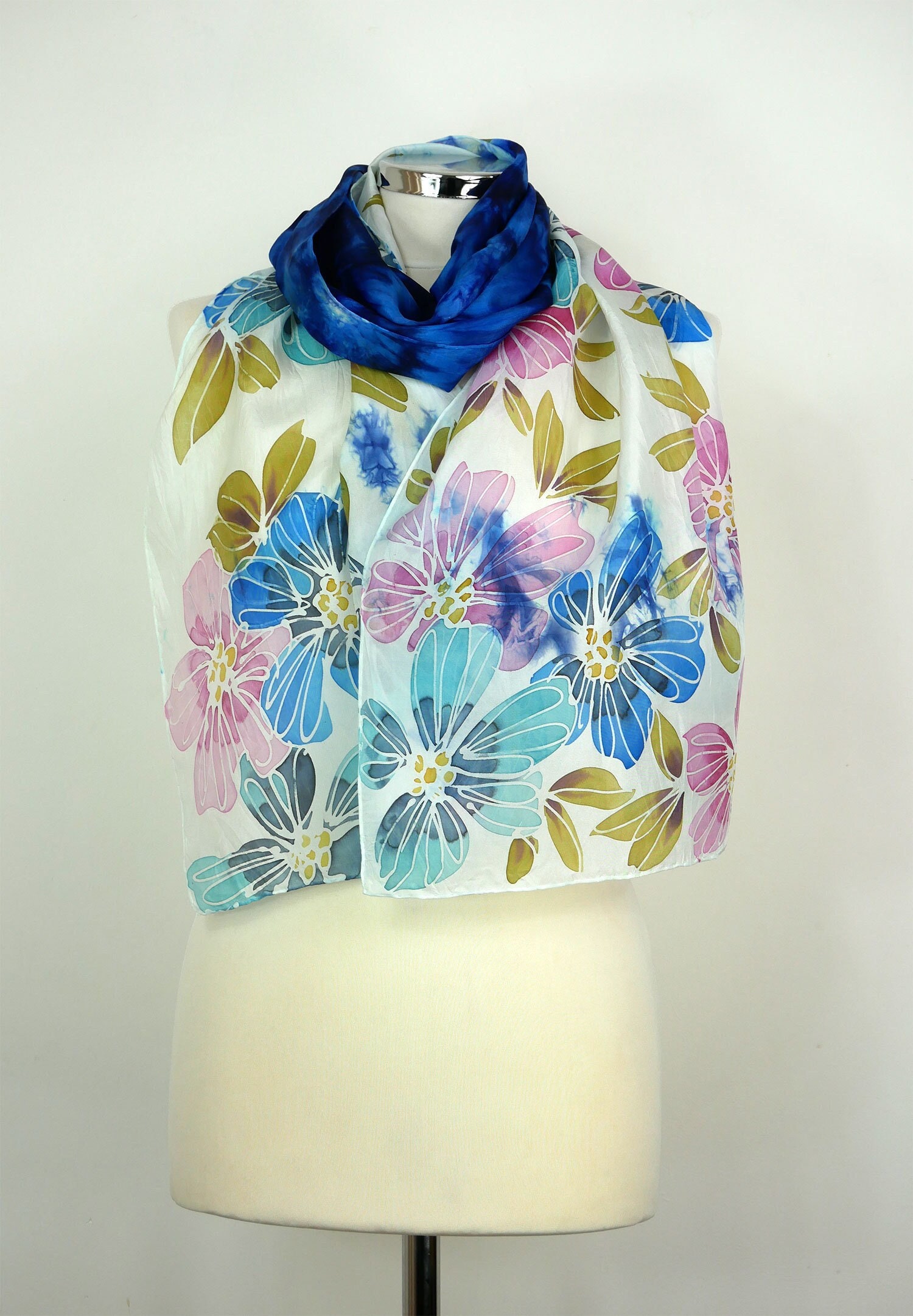 Blue silk scarf hand painted Blue Garden Oblong blue floral silk sc...