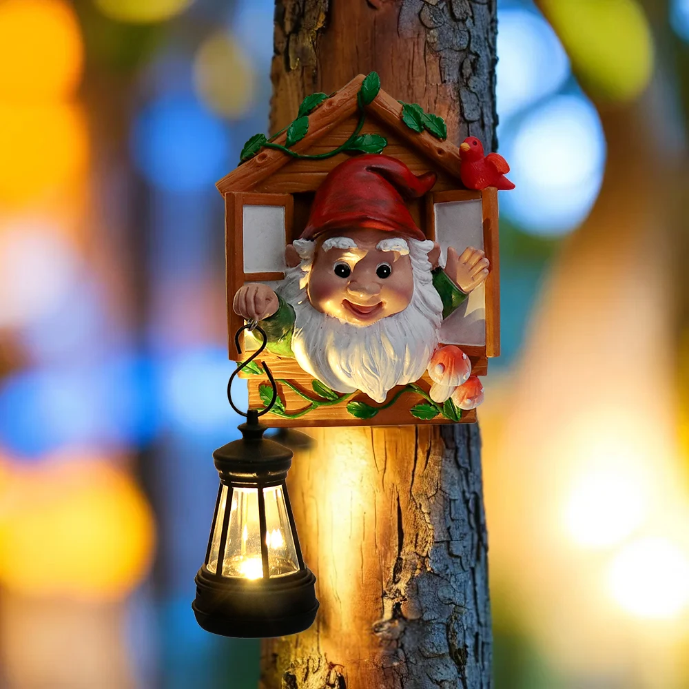 Solar-Powered Gnome Tree Ornament Lamp - Window Gnome Design Auto-O...