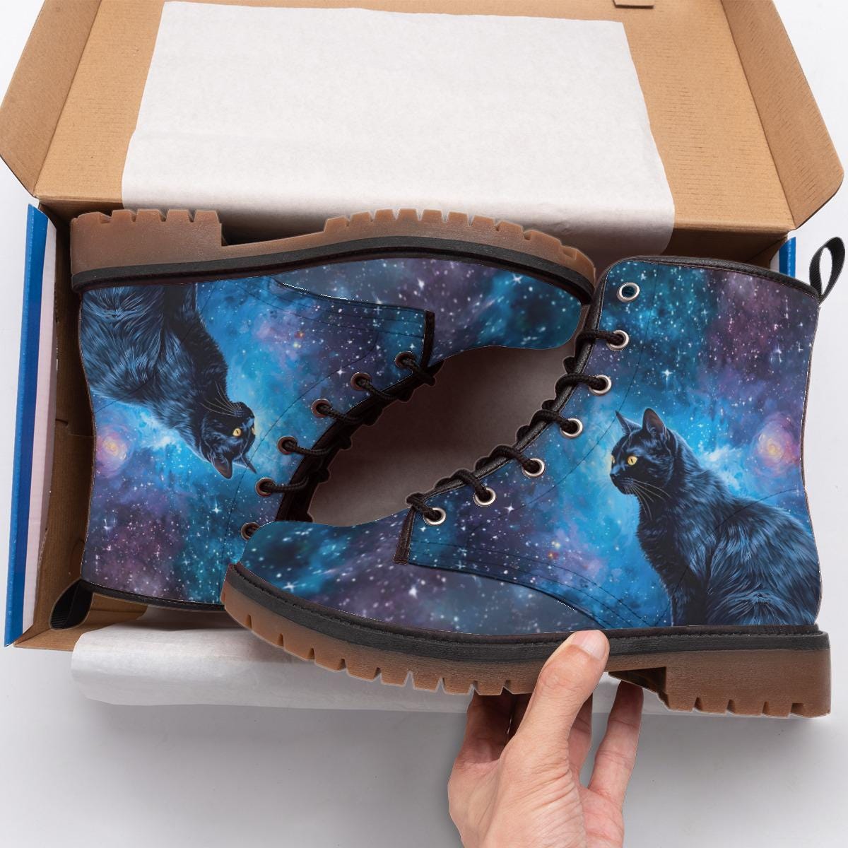 Galaxy Black Cat Martin Boots, Cosmic Cat Combat Boots, Mystic Blac...