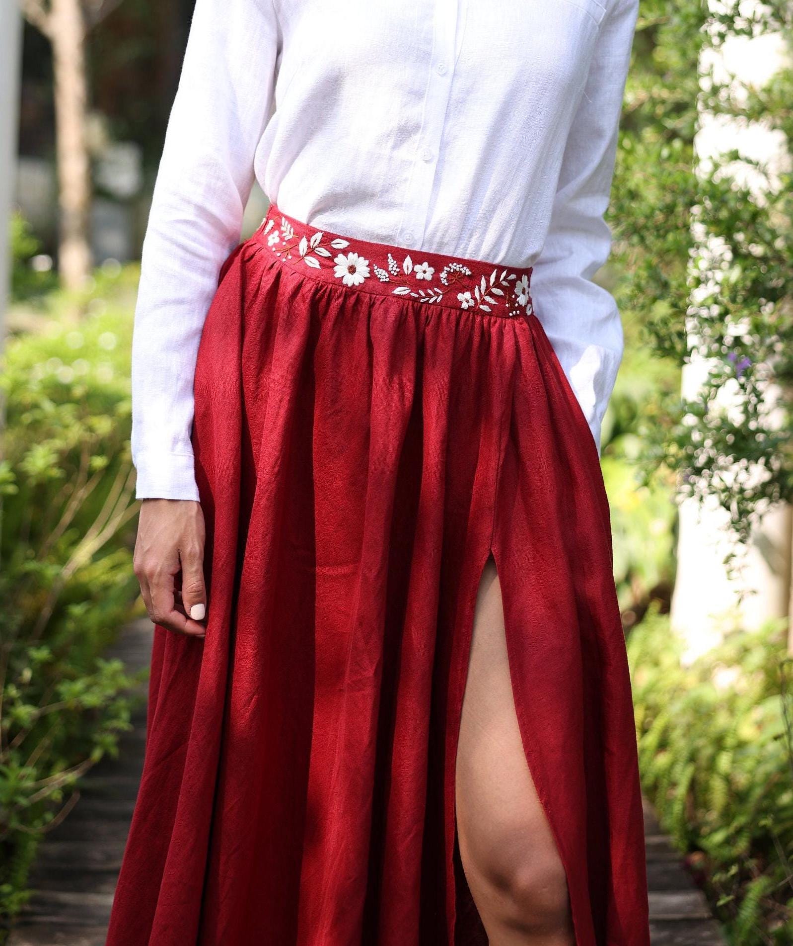 Hand embroidered linen skirt FLORA, Maxi skirt boho, High slit skir...