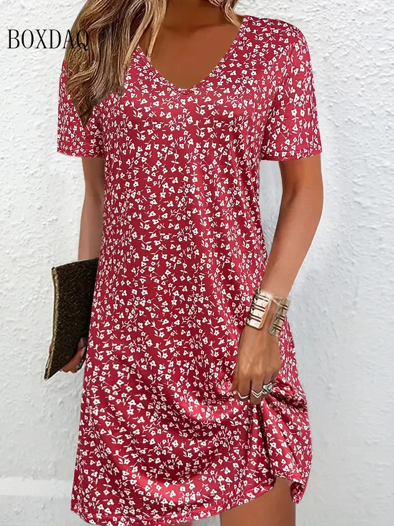 Womens Summer Short Sleeve Notched V Neck Floral Mid Length Dress for Beach Parties and Outdoor Stro...