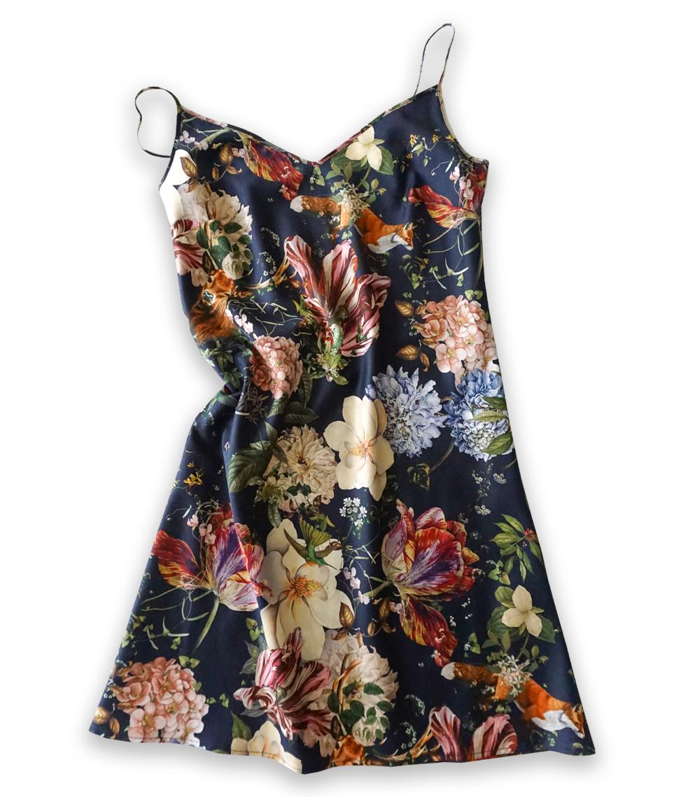 "The Magic Garden blue nightdress, crafted with an impressive floral pattern, reveals an unusua...