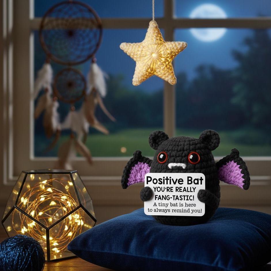 "Let a wave of positivity fly into your space with this handmade crochet Positive Bat plush! Cr...