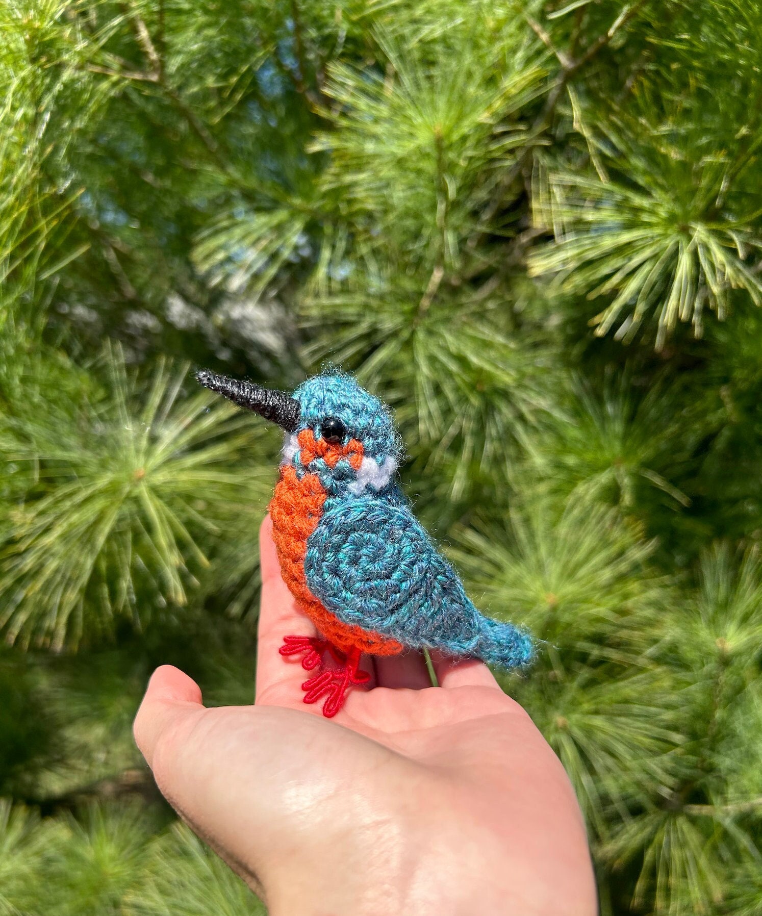 "Meet my crochet Kingfisher -- a striking little bird with a sharp gaze and bold colors, made w...