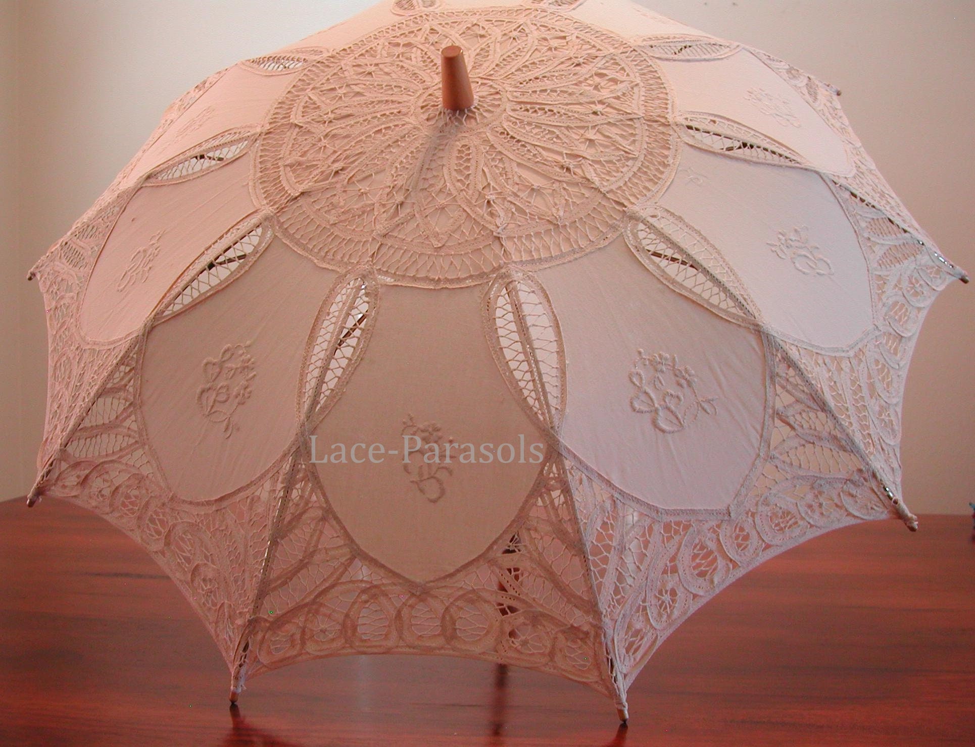 "Beige (ecru) Batten-burg Lace Parasol. Material is 100% cotton. Measures 30\" diameter, 2...