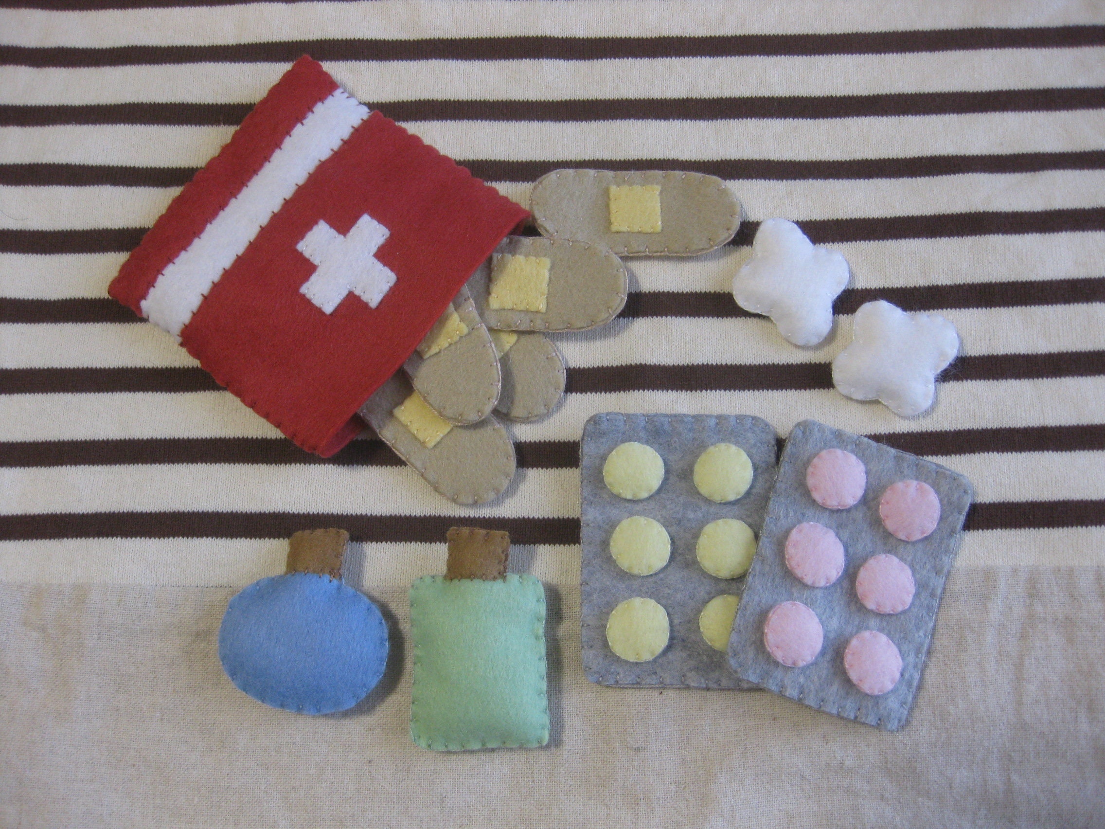 This item is a set of handmade felt items inspired by a first aid kit. The set includes a medicine b...